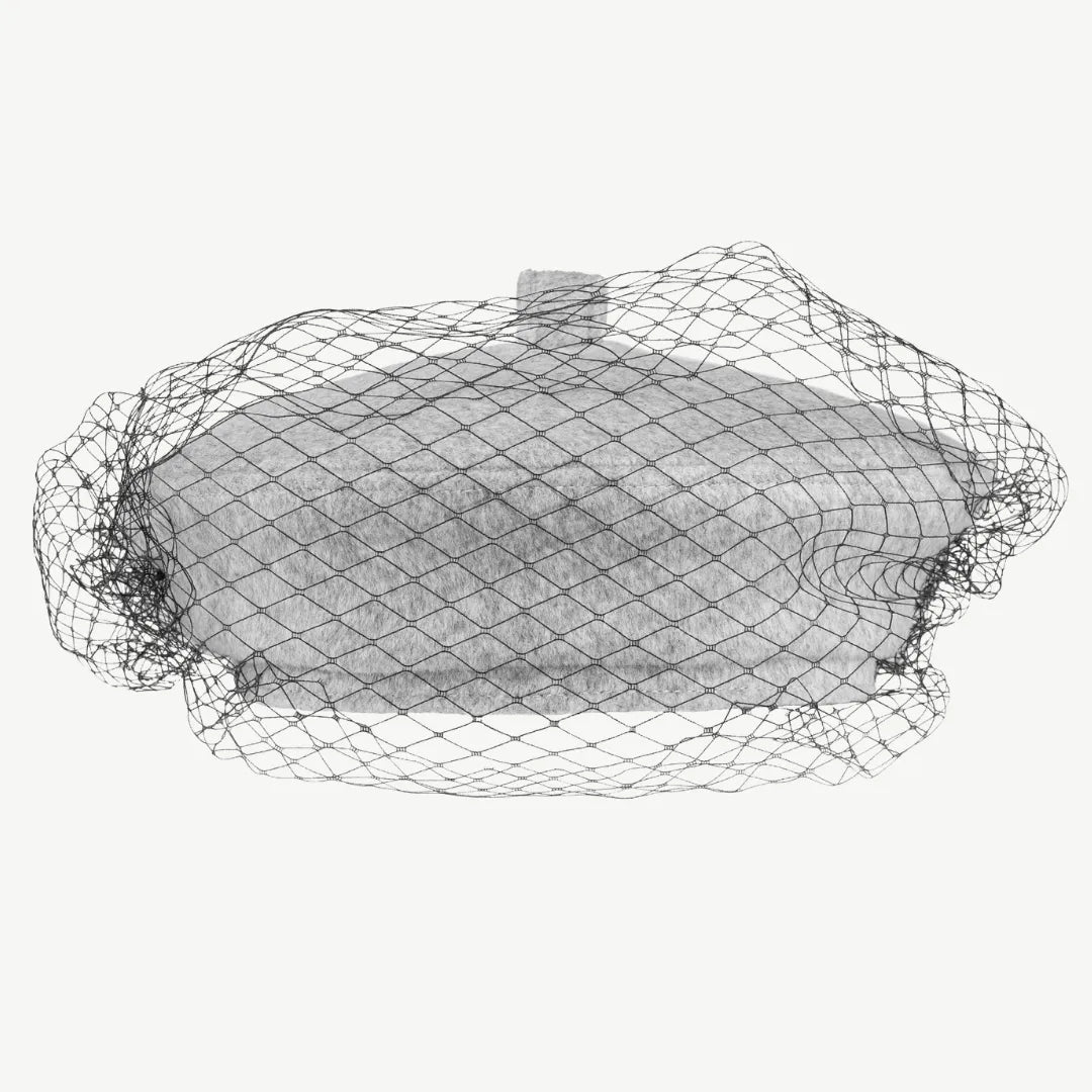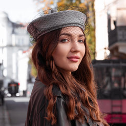 Берет класичної форми з вуаллю, виконаний з натуральної вовни з додаванням кашеміру. Позаду розташована стягуюча рези...