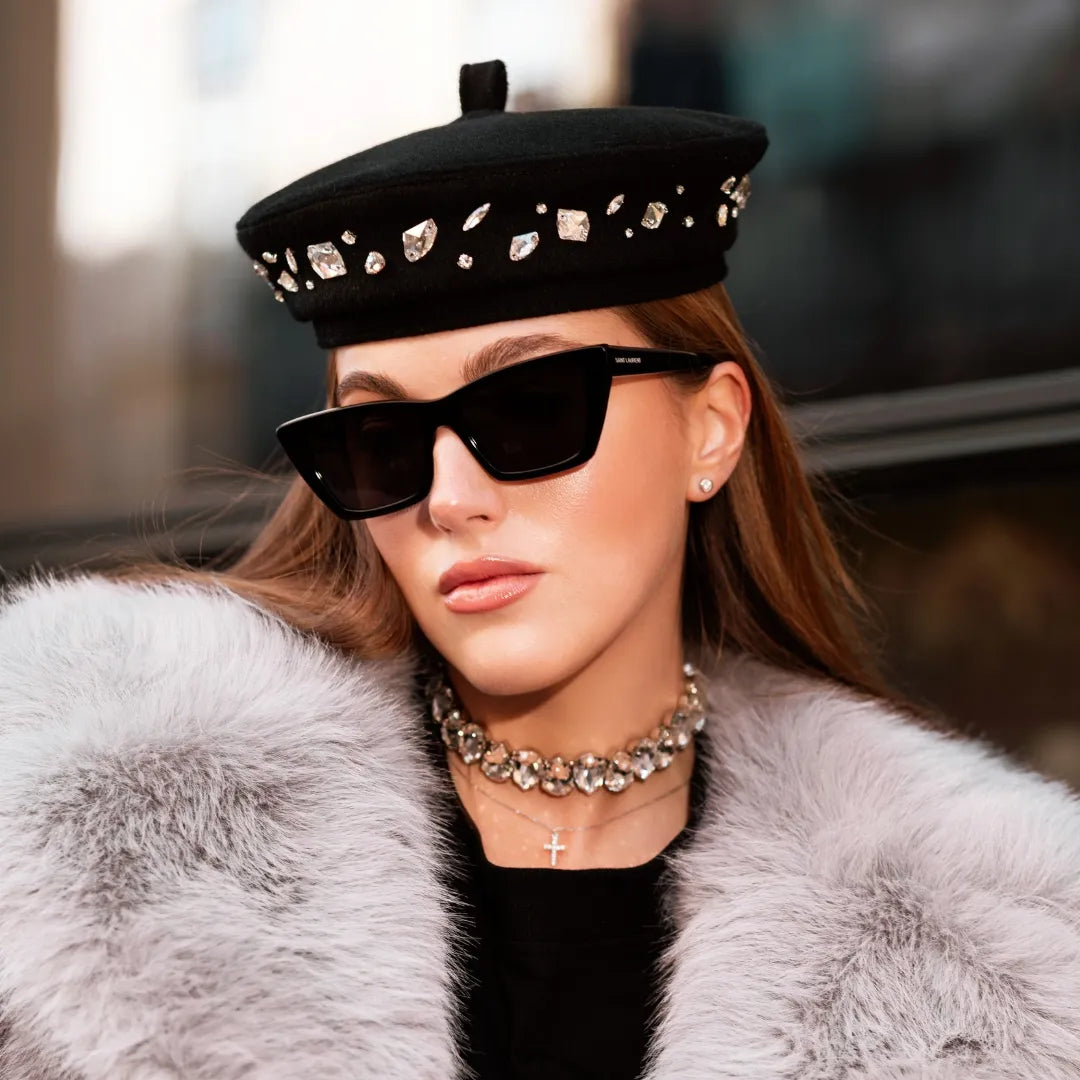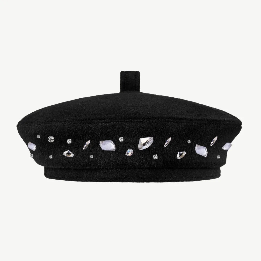 Ефектний головний убір, що покликаний додати сяйва вашому стилю. Блискучі деталі у вигляді страз різних форм та перлин утворюють вишукану композицію на теплому береті. Завдяки стягуючій резинці, що вшита позаду, аксесуар пристосовується до вашого індивідуального рельєфу голови.