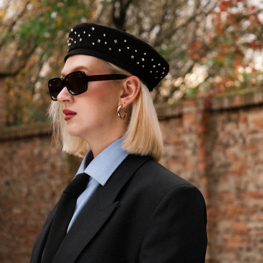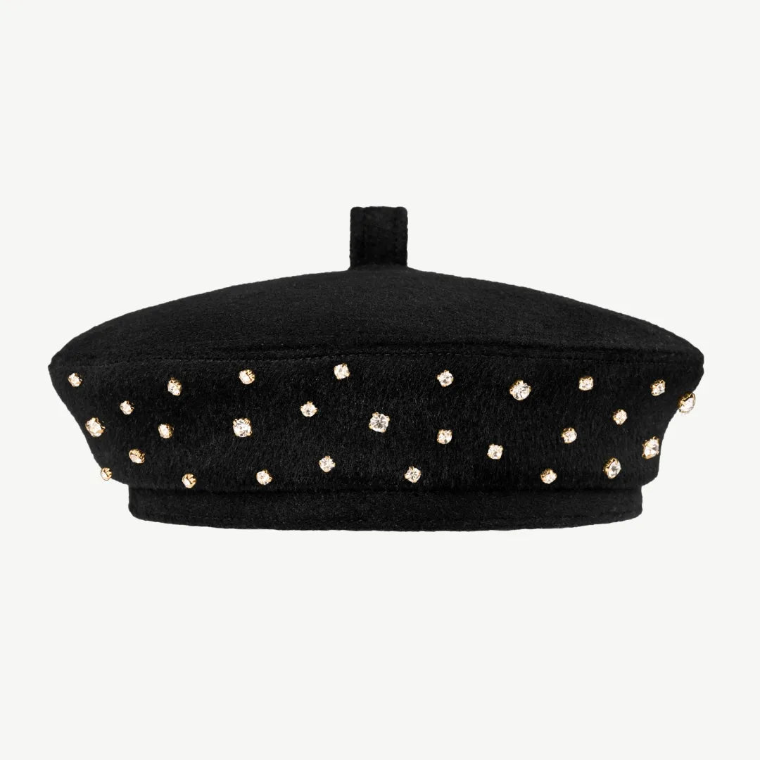 Берет класичної форми з пришитими стразами з натуральної вовни з кашеміром. Позаду розташована стягуюча резинка, що дозволяє підлаштуватись під Ваш розмір голови. Підкладка зроблена з віскози.