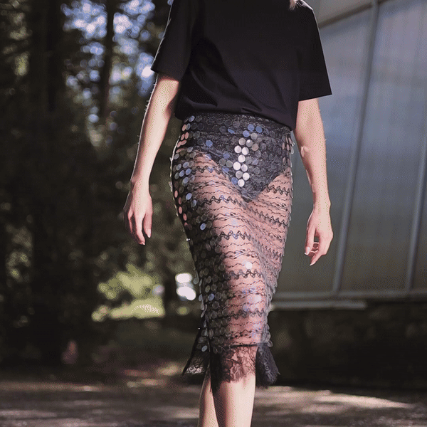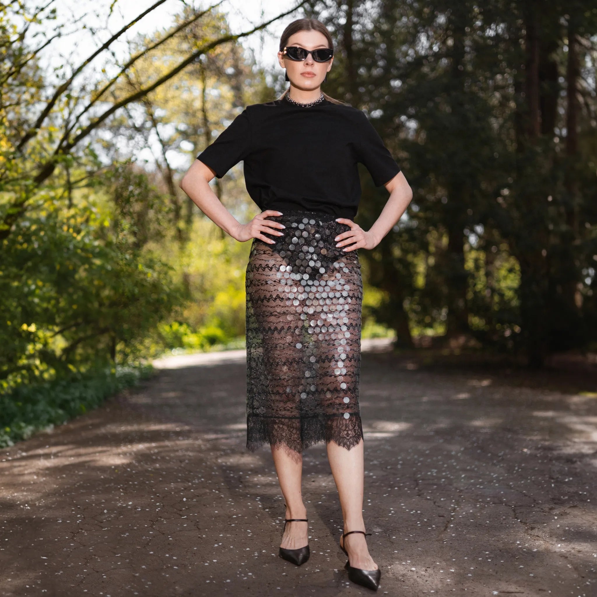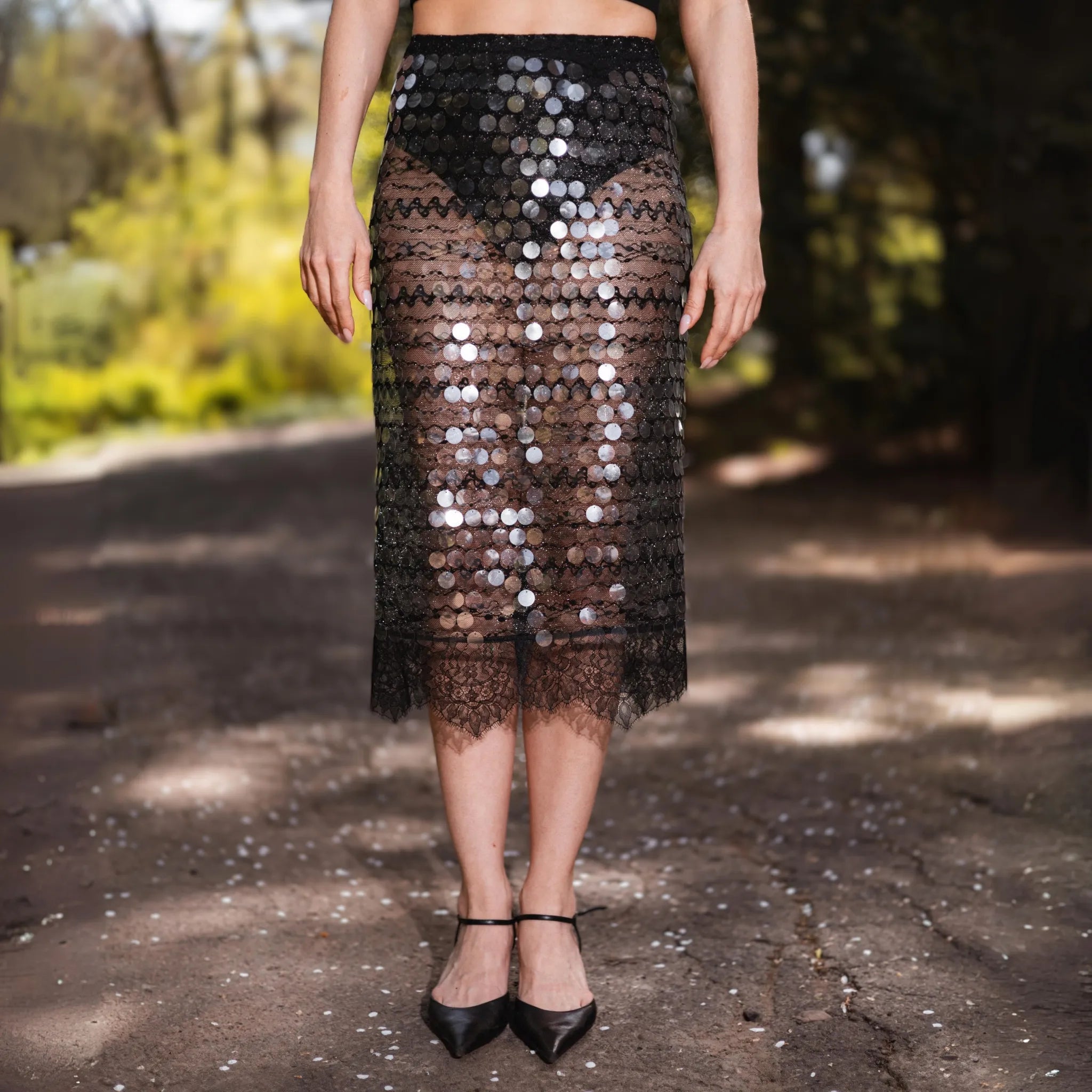 Ловіть кожен промінчик сонця з нашою мереживною спідницею в паєтках. Виріб має приталений крій, аби підкреслити неповторні вигини вашого тіла. Експериментуйте з образами, адже вона легко поєднується хоч зі звичайною футболкою, хоч із базовою сорочкою.