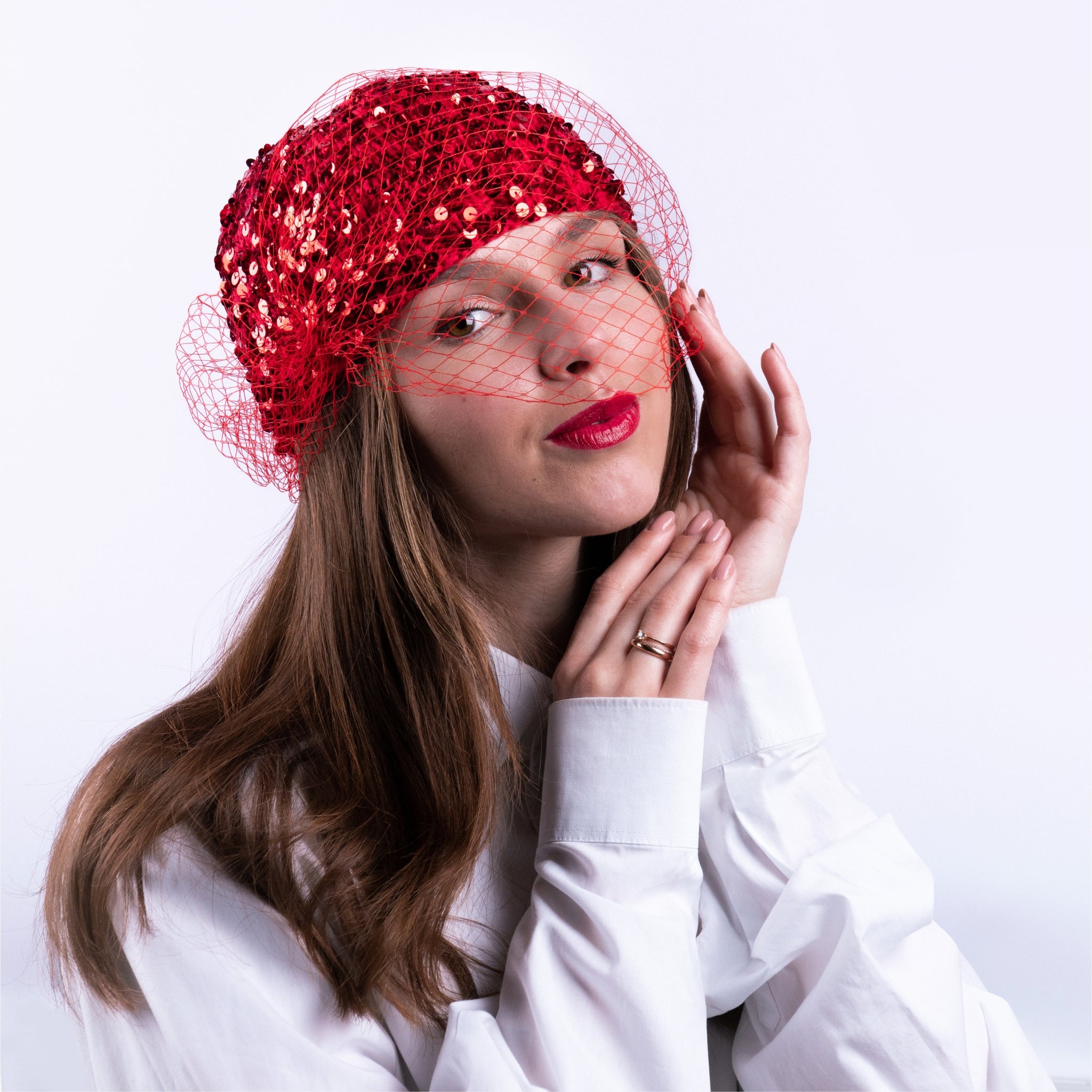 Шапка біні, зв'язана вручну з натуральної пряжі з паєтками, прикрашена вуаллю, додає загадковості і яскравості повсякденному образу. Вуаль можна регулювати вище на шапку та опускати на очі.