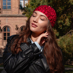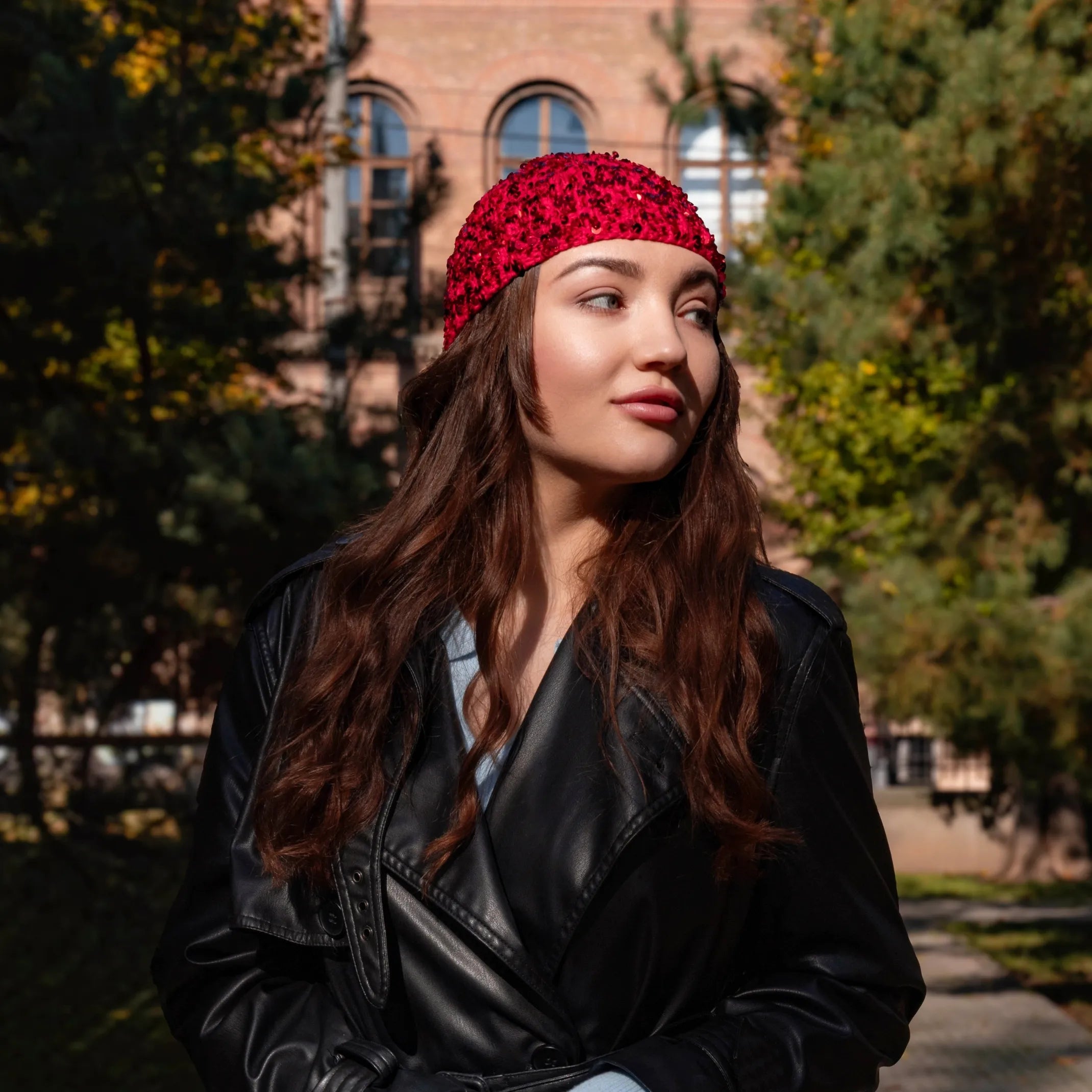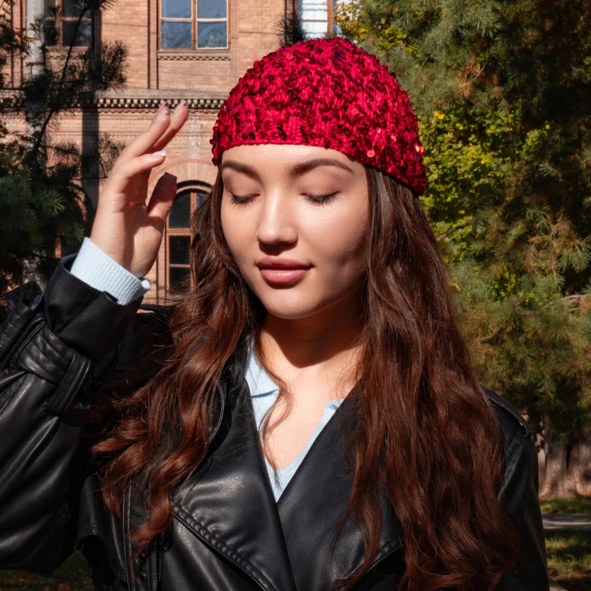 Шапка біні, зв'язана вручну з натуральної пряжі з паєтками, додає загадковості і яскравості повсякденному образу.