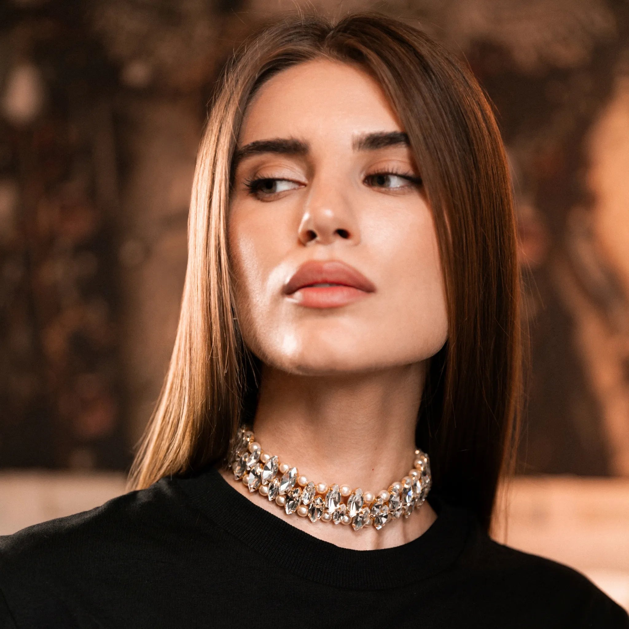 Відчуйте розкіш сяйва на собі! Витончений чокер створений з двох рядів блискучих страз-човників і перлин. Фіксація пр...