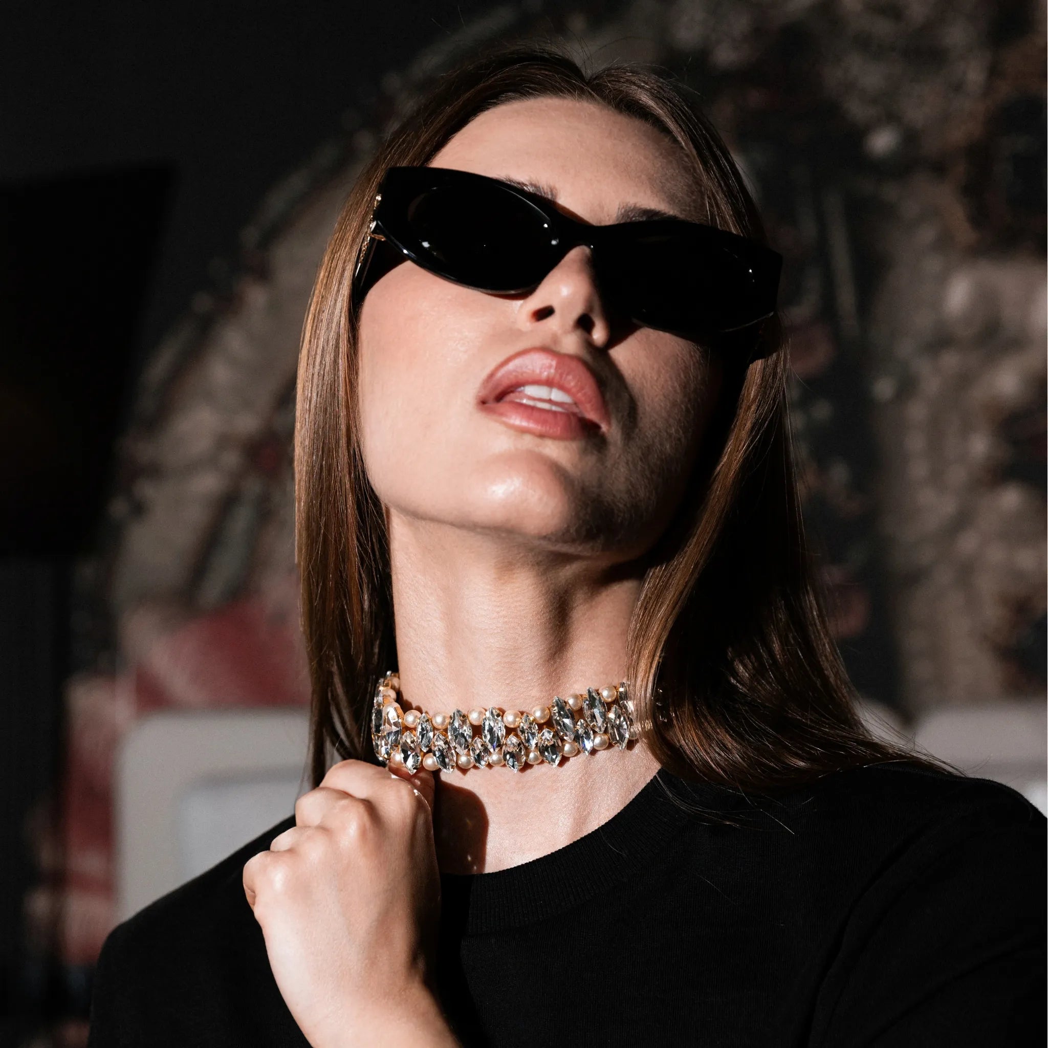 Відчуйте розкіш сяйва на собі! Витончений чокер створений з двох рядів блискучих страз-човників і перлин. Фіксація прикраси відбувається за допомогою констрастної сатинової стрічки, яку ви можете зав'язати у ніжний бант.