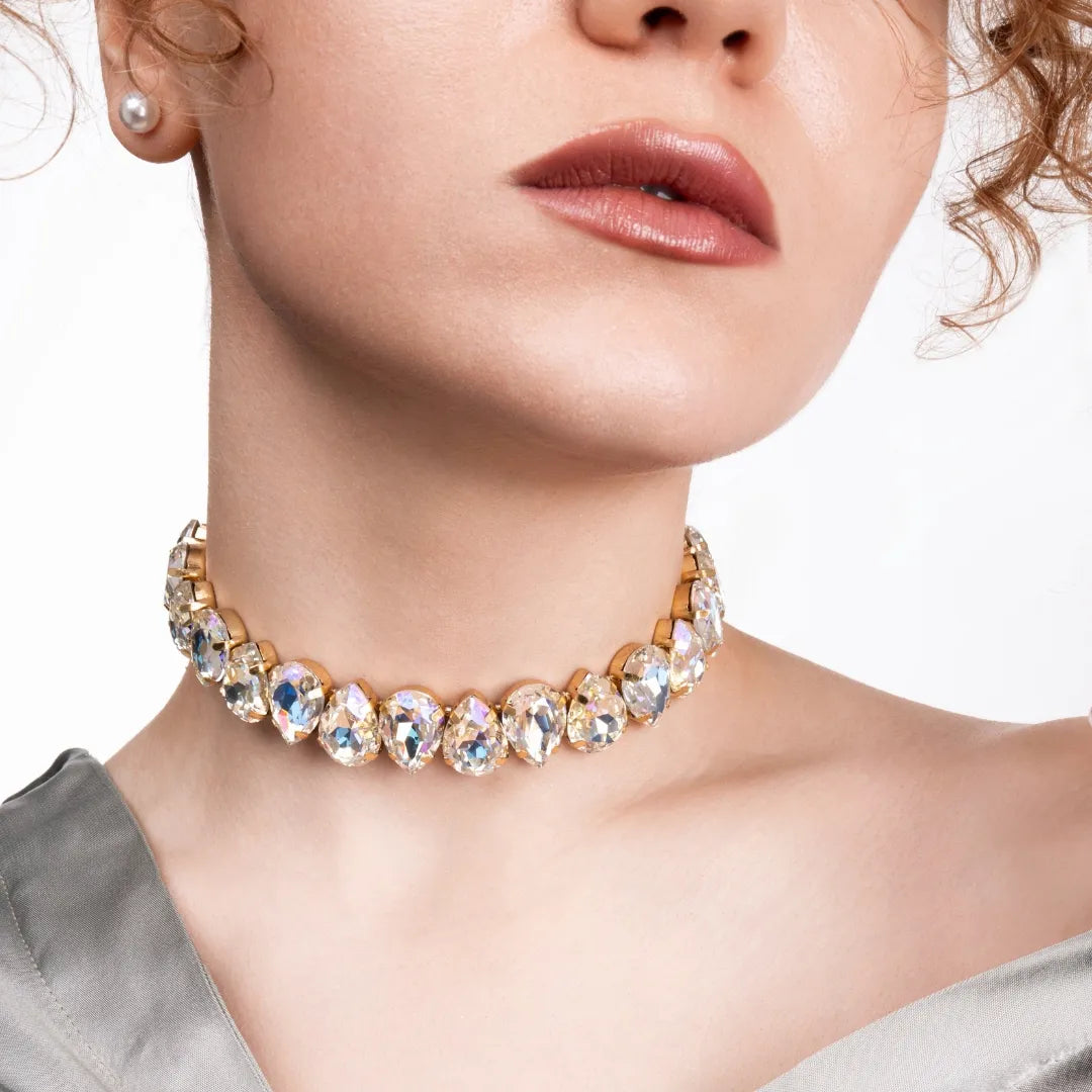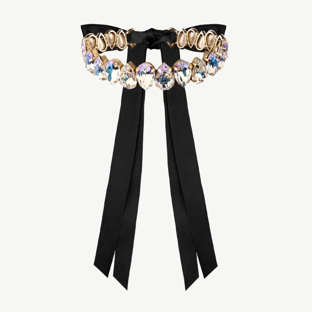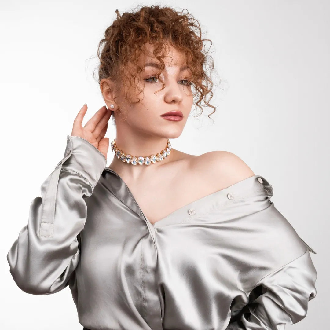 Захоплюючий завершальний штрих вашого аутфіту — чокер Аеліна. Мінімалістичний, але ефектний дизайн у вигляді страз-крапель, нагадує переосмислення епохи відродження на сучасний повсякденний лад. Завдяки сатиновій стрічці, що фіксує аксесуар, ви можете регулювати його довжину.