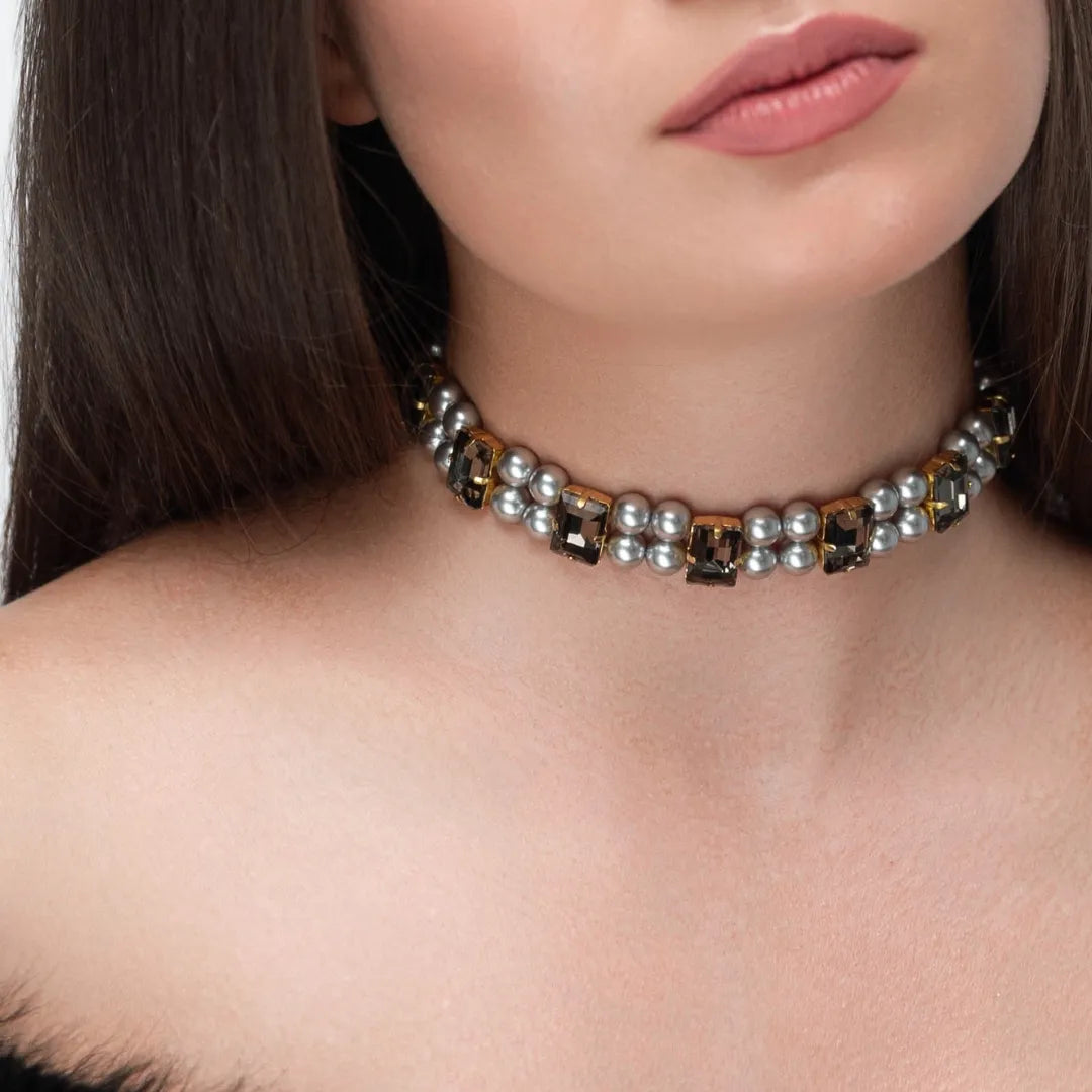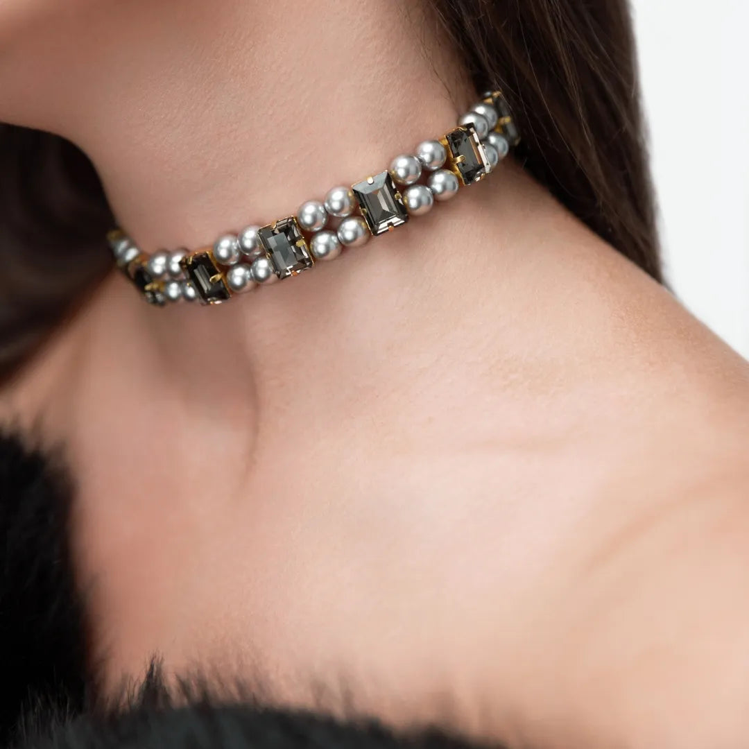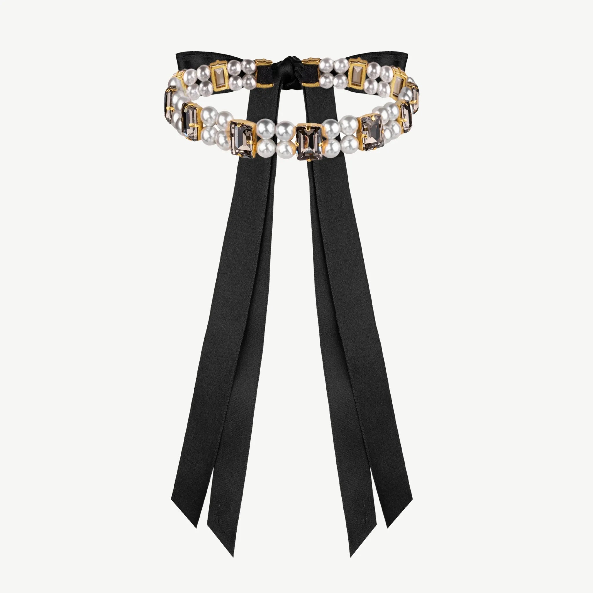 Створюйте різноманітні цікаві образи з особливим шармом. Сяюча комбінація прямокутних кришталевих страз та перлин поєдналась в чокері Бекка. З сатинових стрічок, що фіксують чокер, Ви можете зав'язати елегатний бант, як з лицьової сторони, так і зі спини.