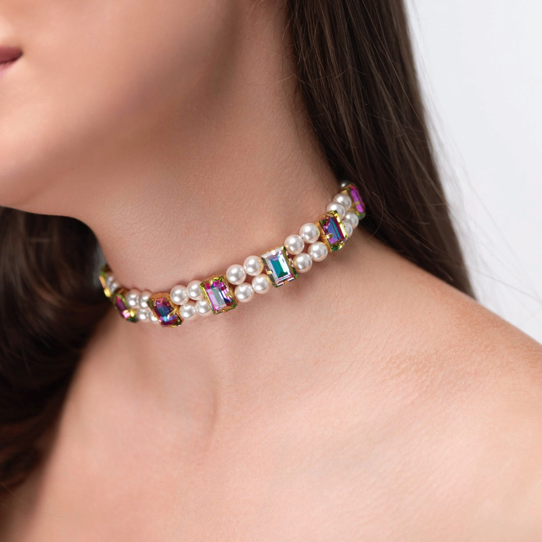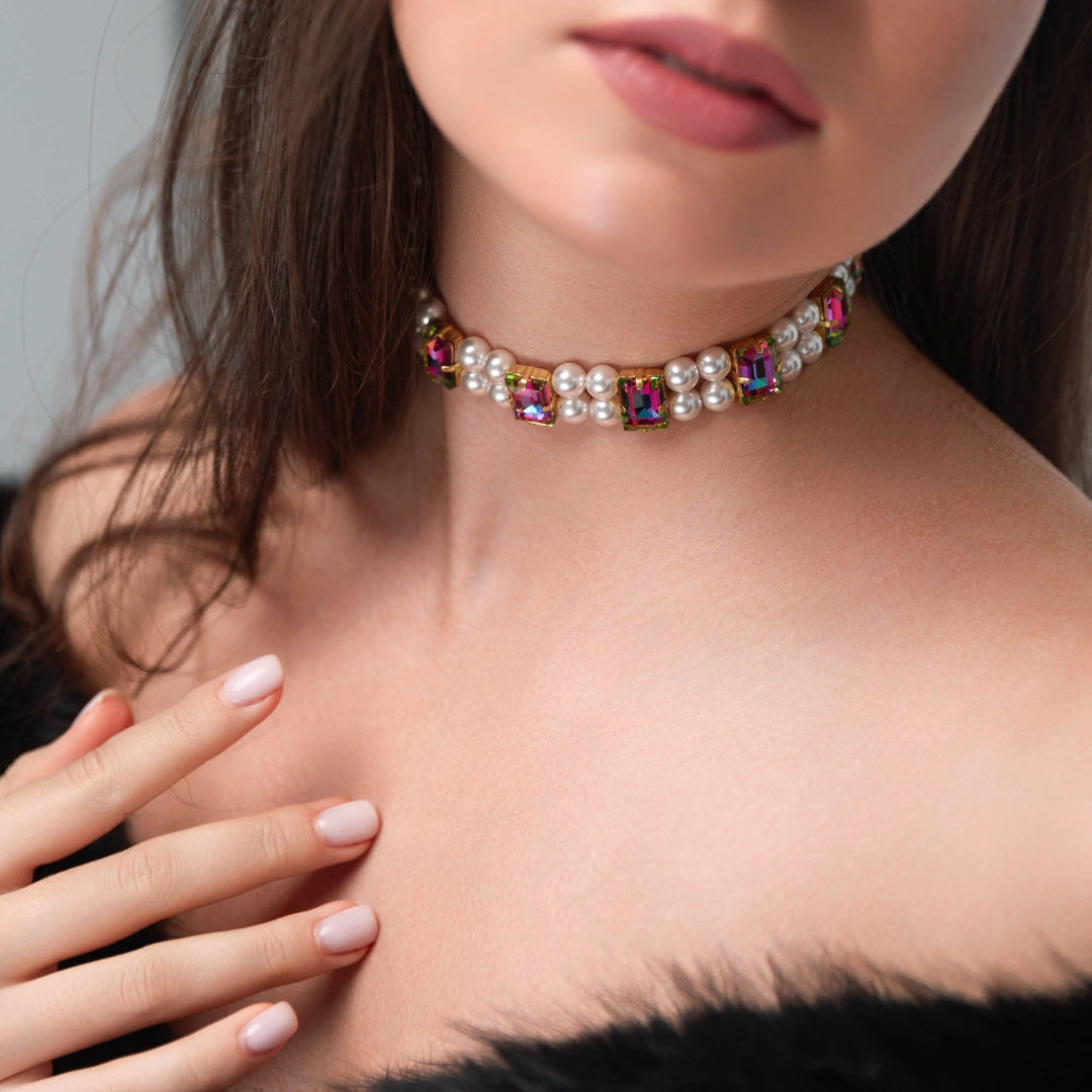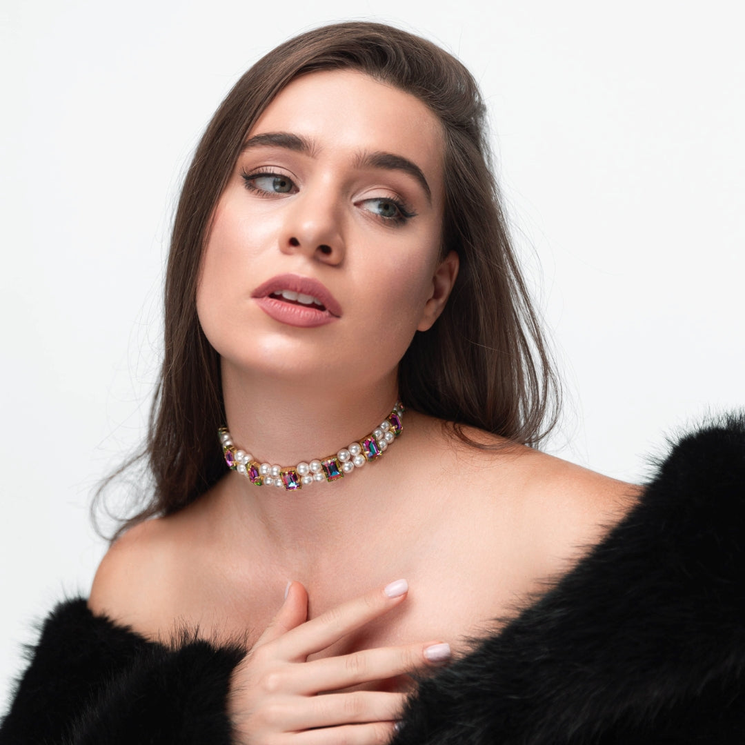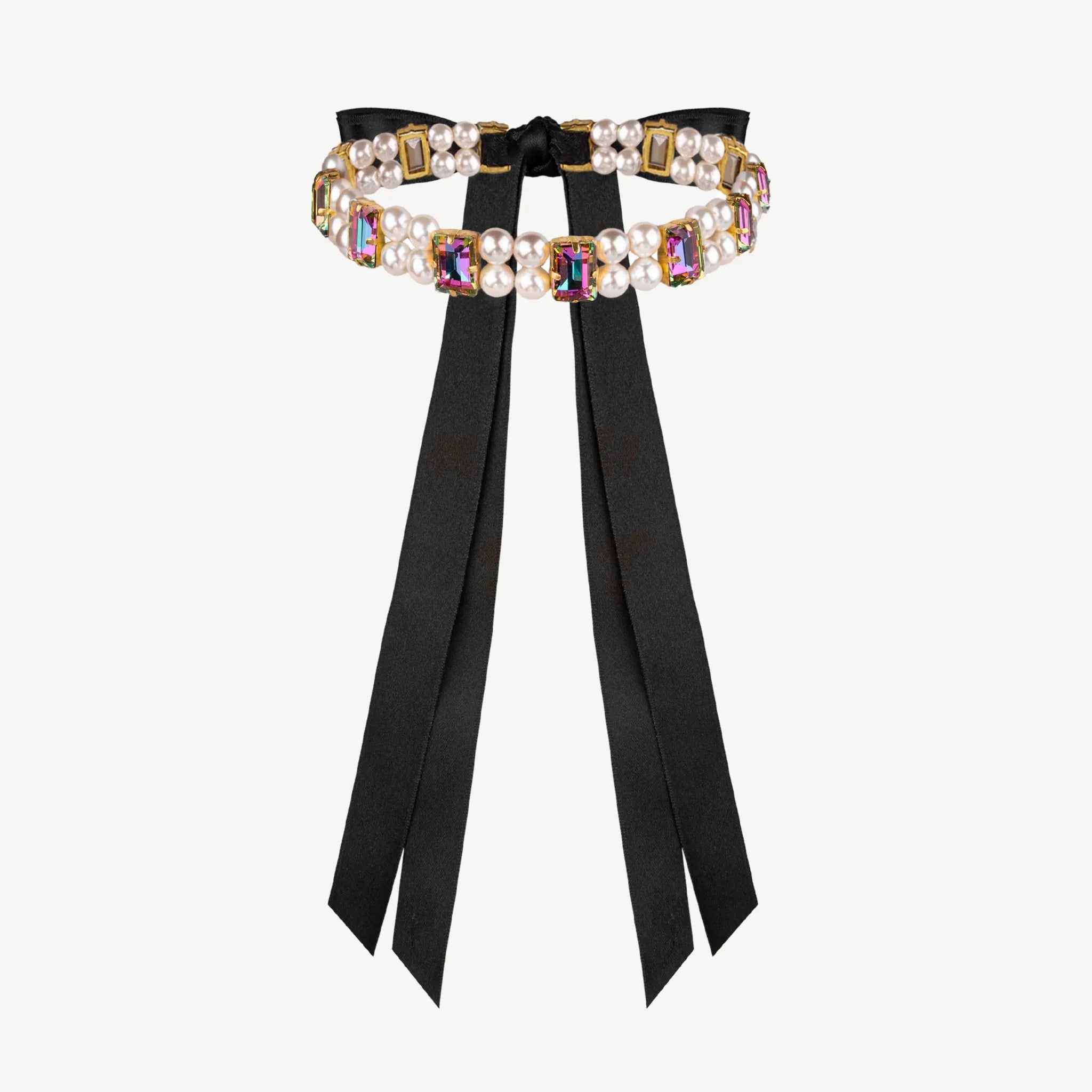 Створюйте різноманітні цікаві образи з особливим шармом. Сяюча комбінація прямокутних кришталевих страз та перлин поєдналась в чокері Бекка. З сатинових стрічок, що фіксують чокер, Ви можете зав'язати елегатний бант, як з лицьової сторони, так і зі спини.