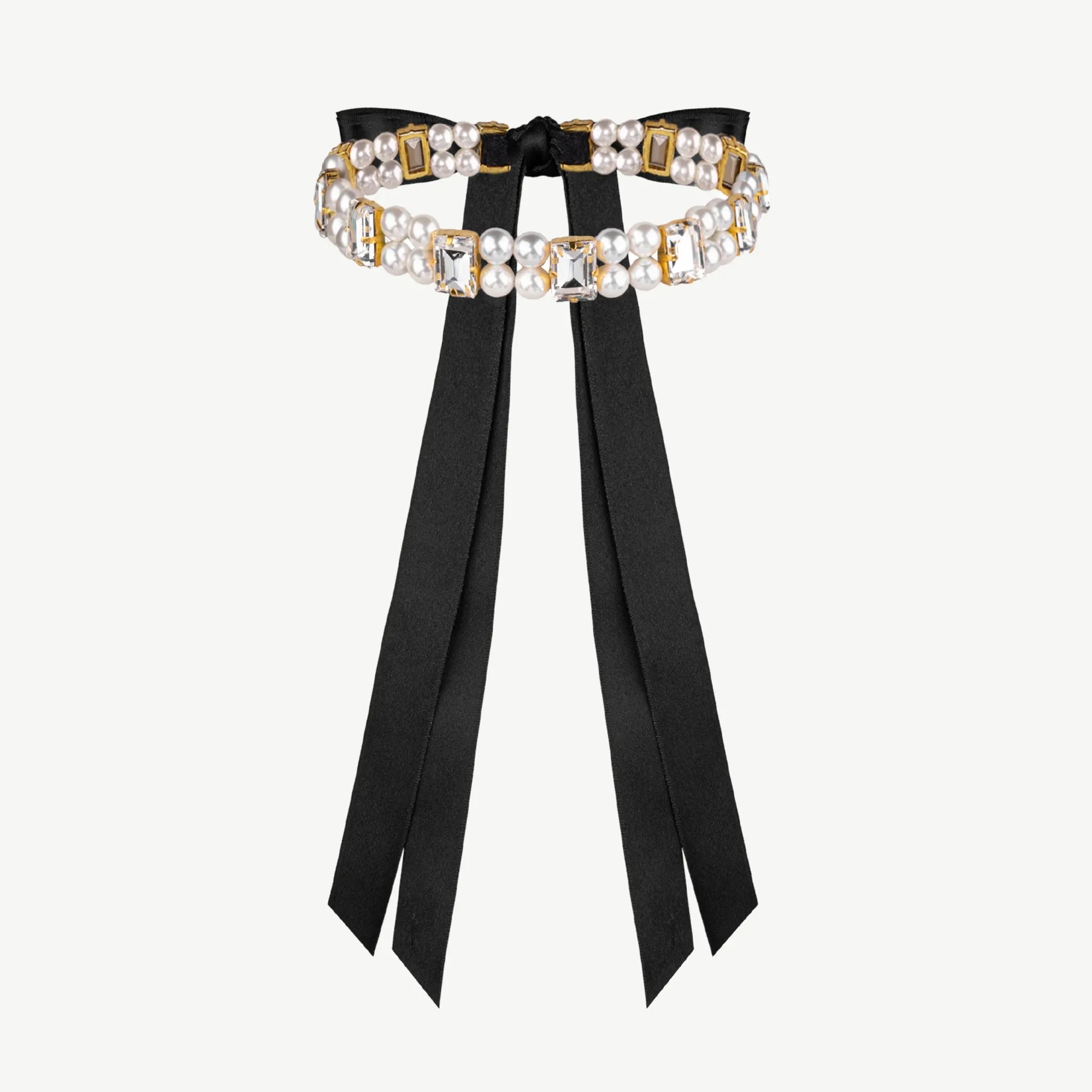 Матеріали: прямокутні кришталеві стрази, 8 мм керамічні перлини, сатинова стрічка Вага: 60 грам Довжина: стразовий ряд — 33 см, стрічки по 45 см