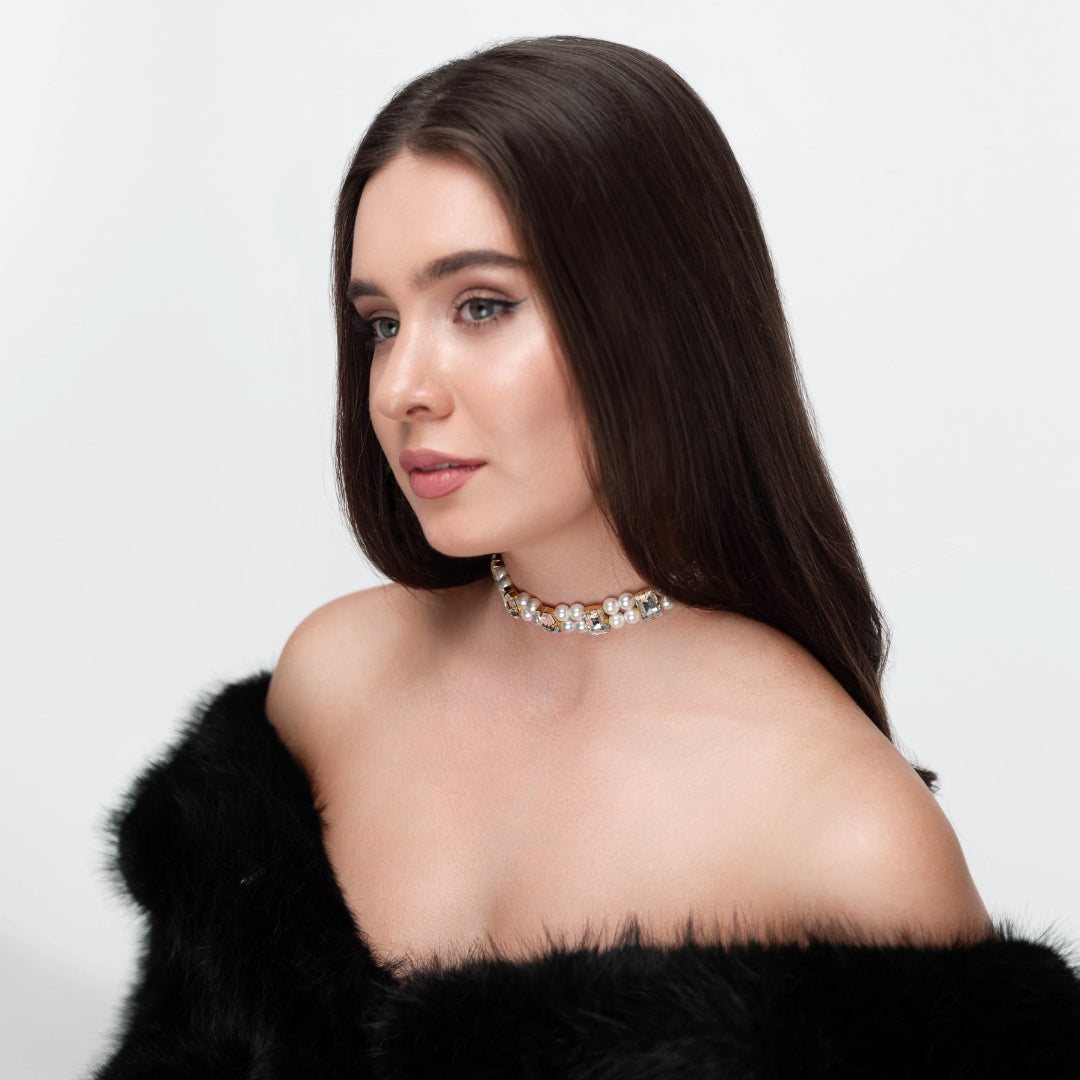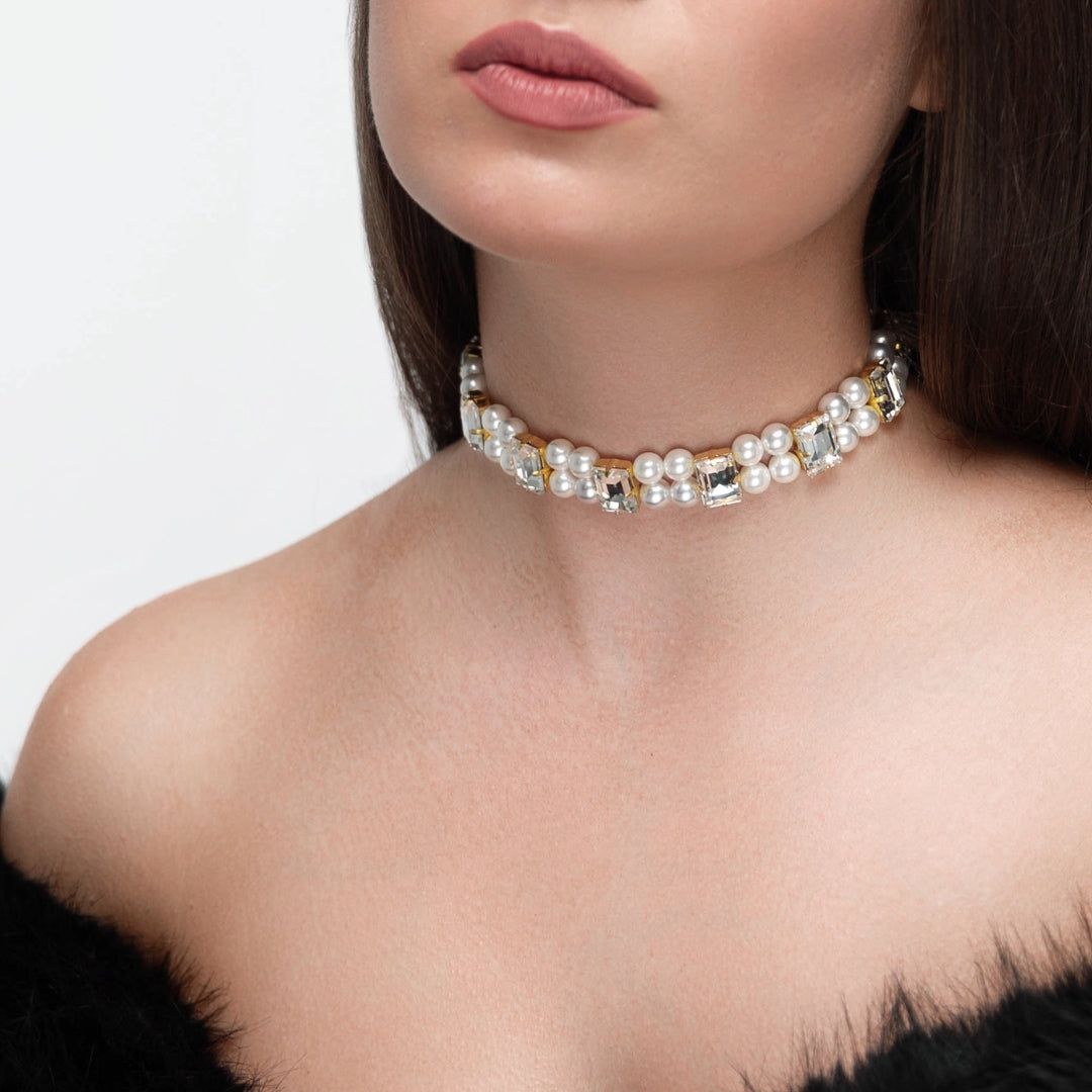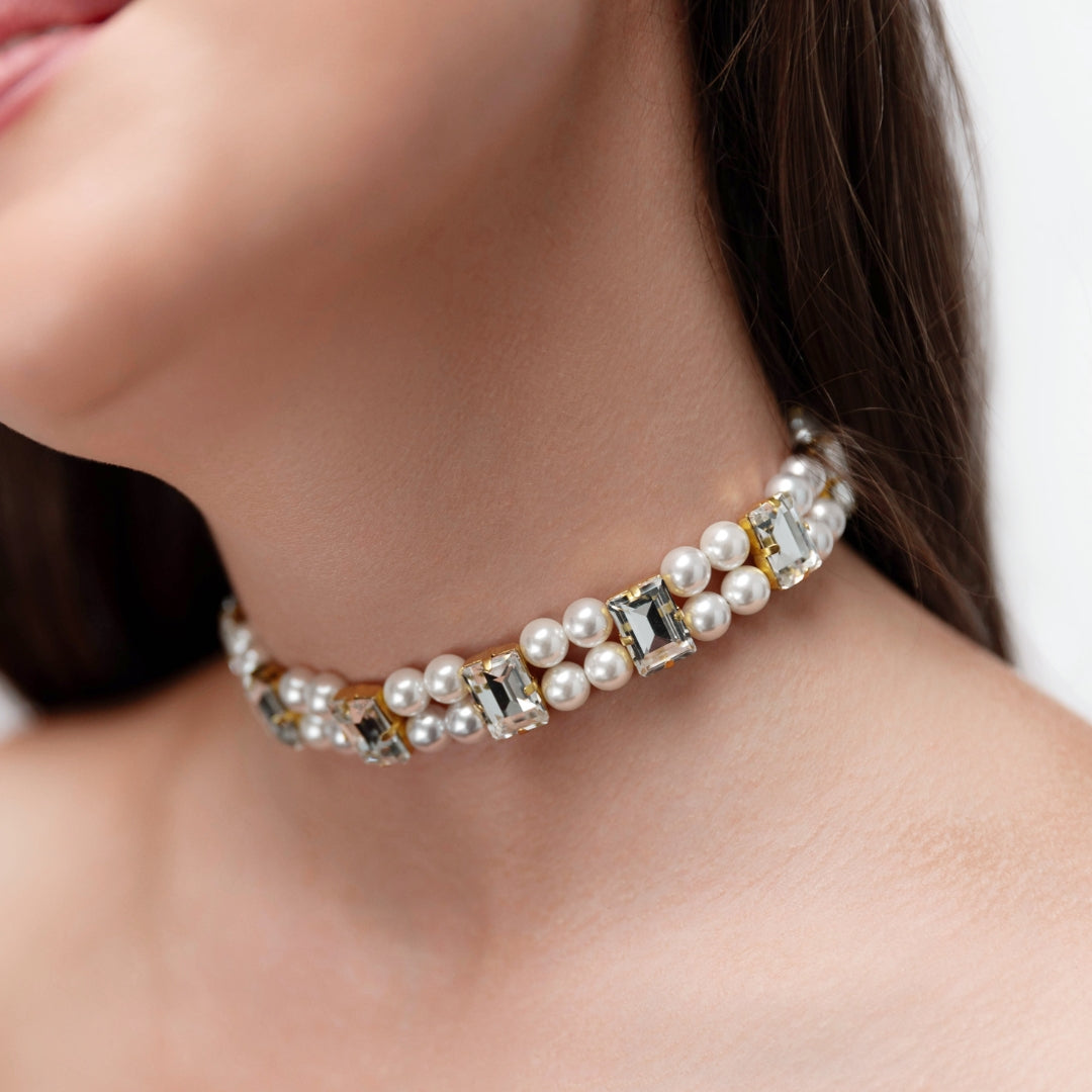 Створюйте різноманітні цікаві образи з особливим шармом. Сяюча комбінація прямокутних кришталевих страз та перлин поєдналась в чокері Бекка. З сатинових стрічок, що фіксують чокер, Ви можете зав'язати елегатний бант, як з лицьової сторони, так і зі спини.