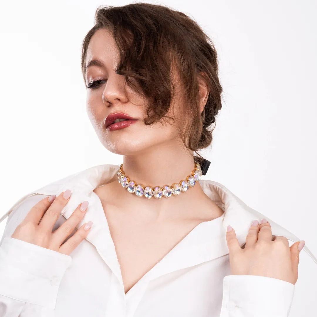 Додайте нотку драматизму з нашим вишуканим чокером Мейв. Масивні кришталеві стрази-овали створюють цікавий сяючий ряд...