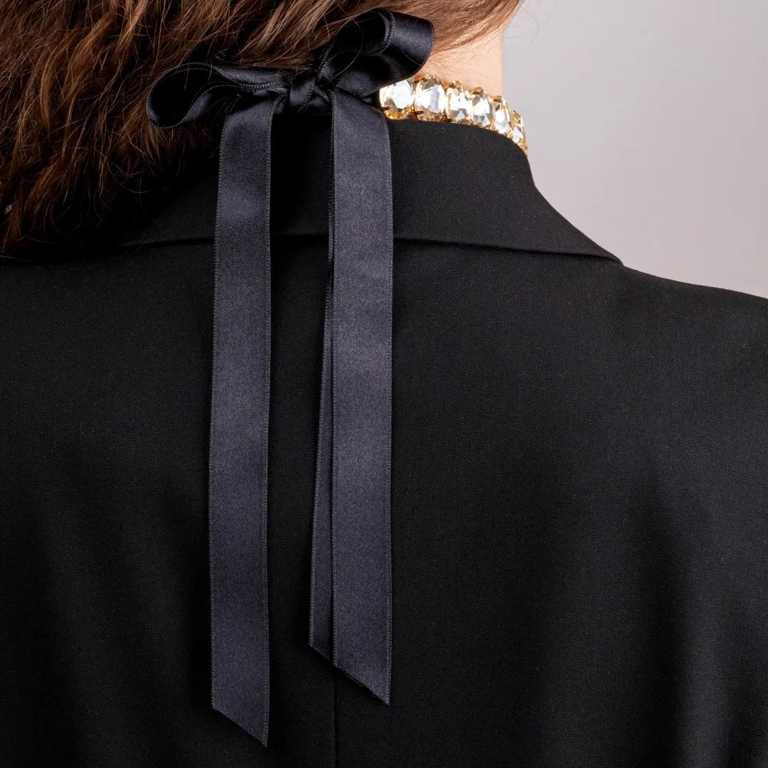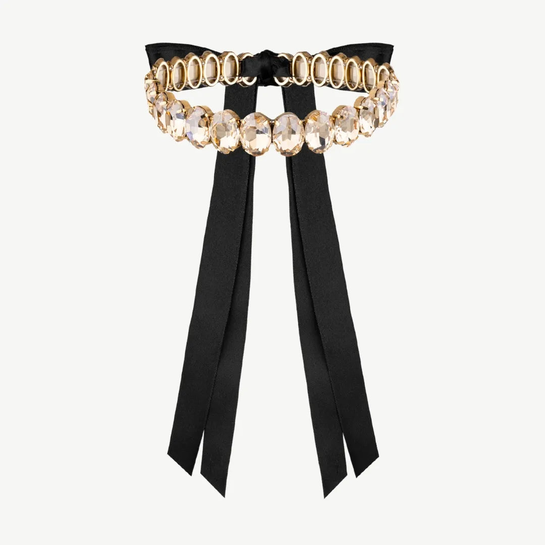 Додайте нотку драматизму з нашим вишуканим чокером Мейв. Масивні кришталеві стрази-овали створюють цікавий сяючий ряд, який відблискує під будь-яким кутом. Ви можете регулювати та фіксувати прикрасу завдяки стрічкам з сатину, які завершують аксесуар.