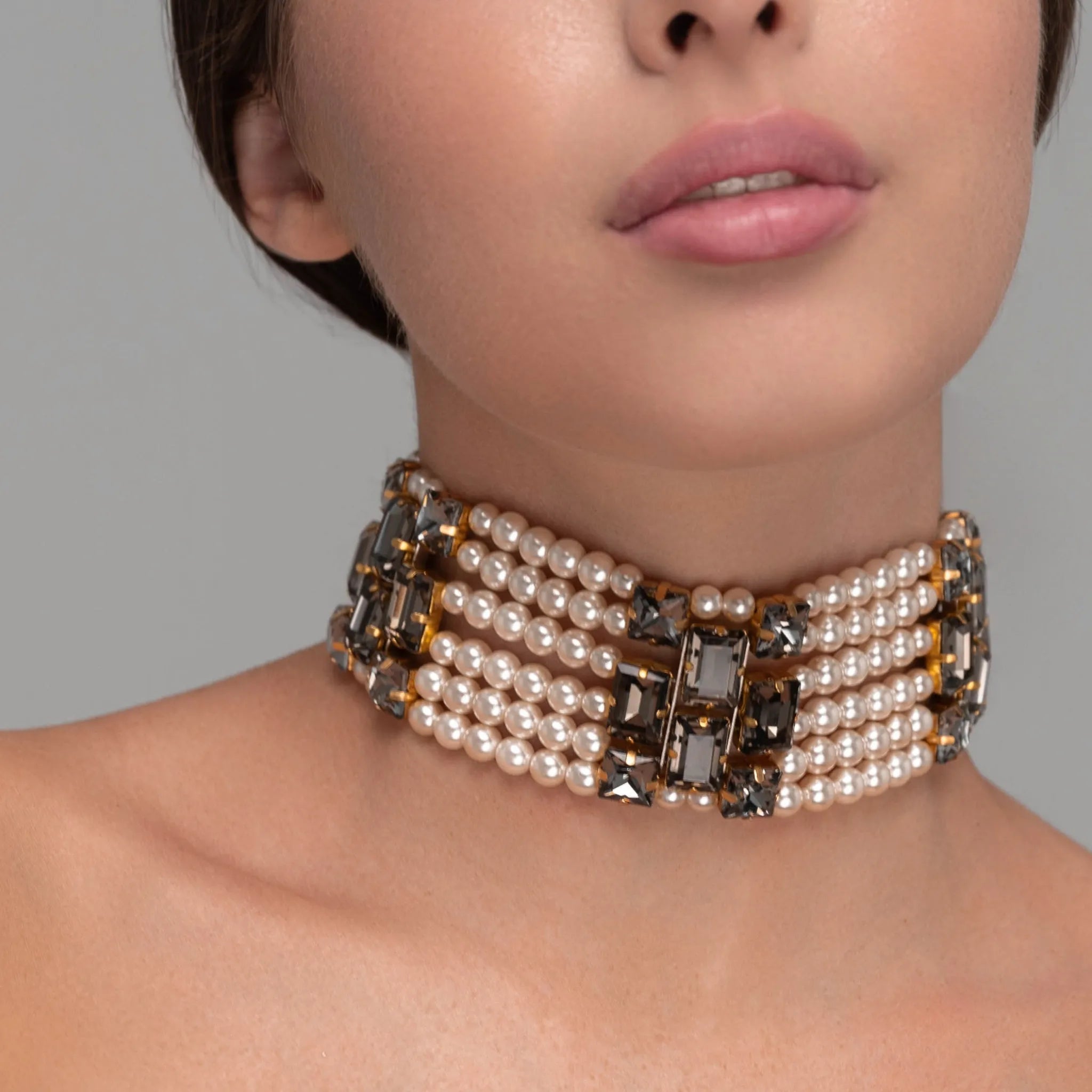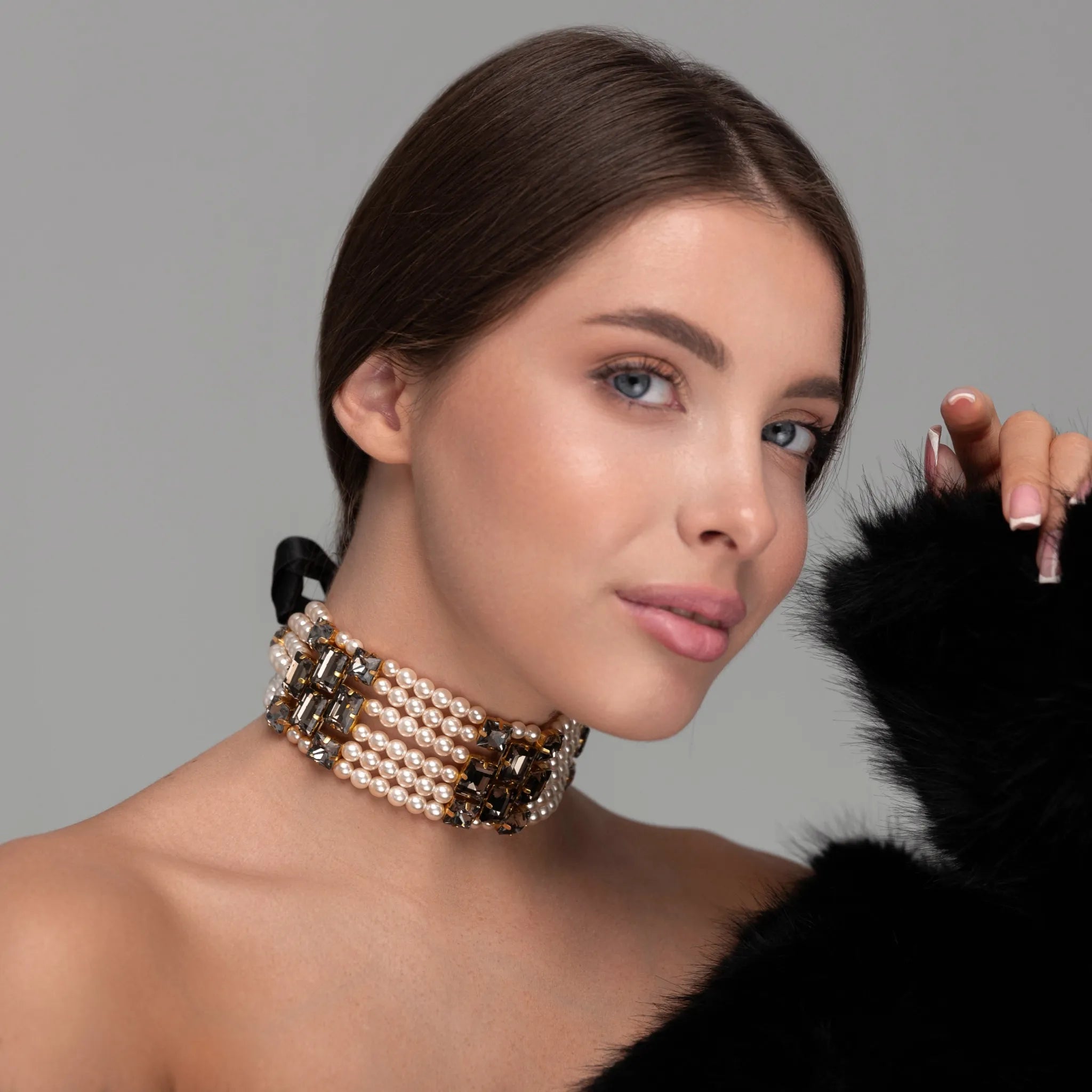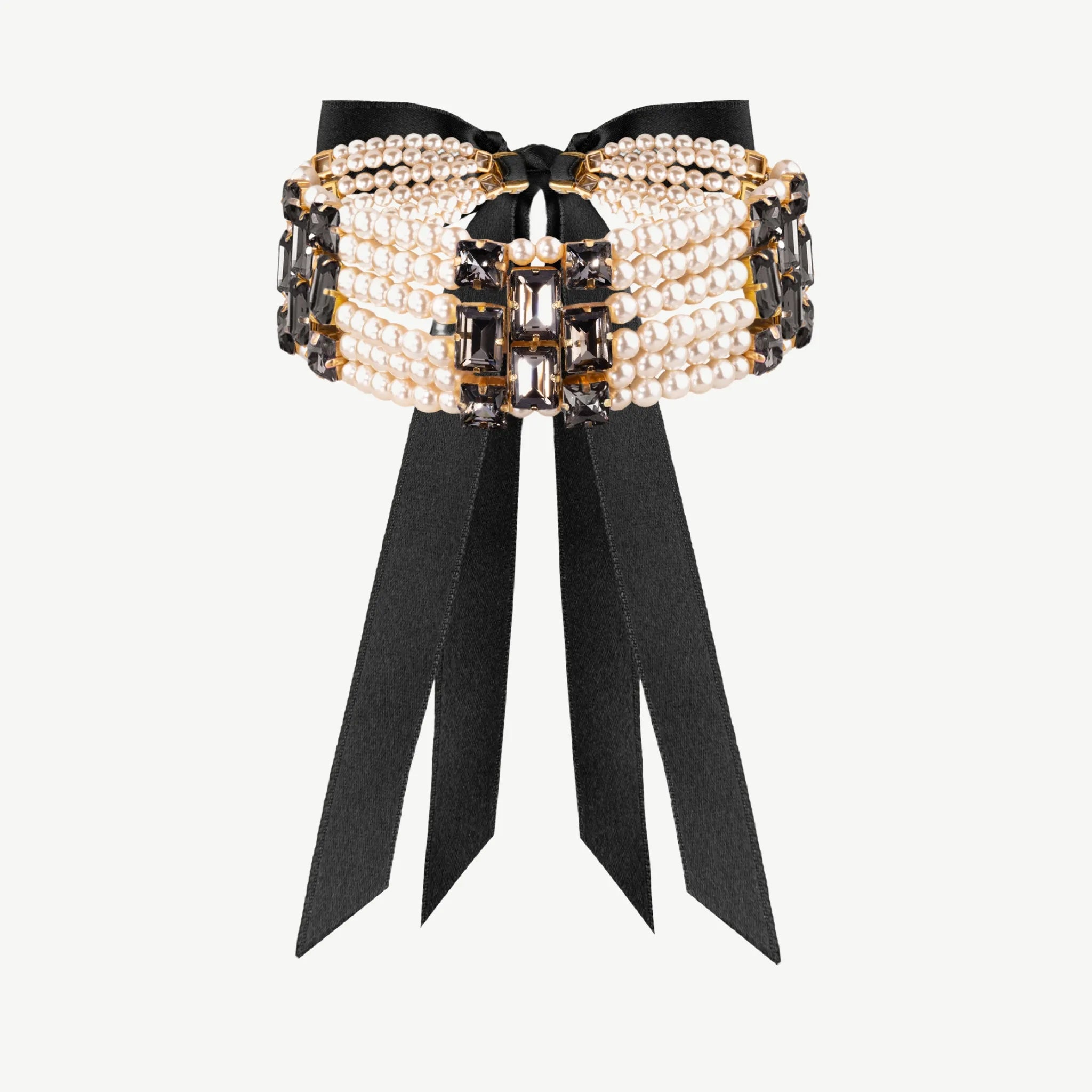 Екстра блиск для ваших незабутніх образів! Чокер Неста — це поєднання тендітності завдяки перламутровому блиску та зухвалості у вигляді кришталевих страз чітких форм. Прикраса традиційно фіксується сатиновою стрічкою, яка може бути зав'язана у бант. Обирайте цей аксесуар для важливих подій, або ж для запальних коктельних вечірок.