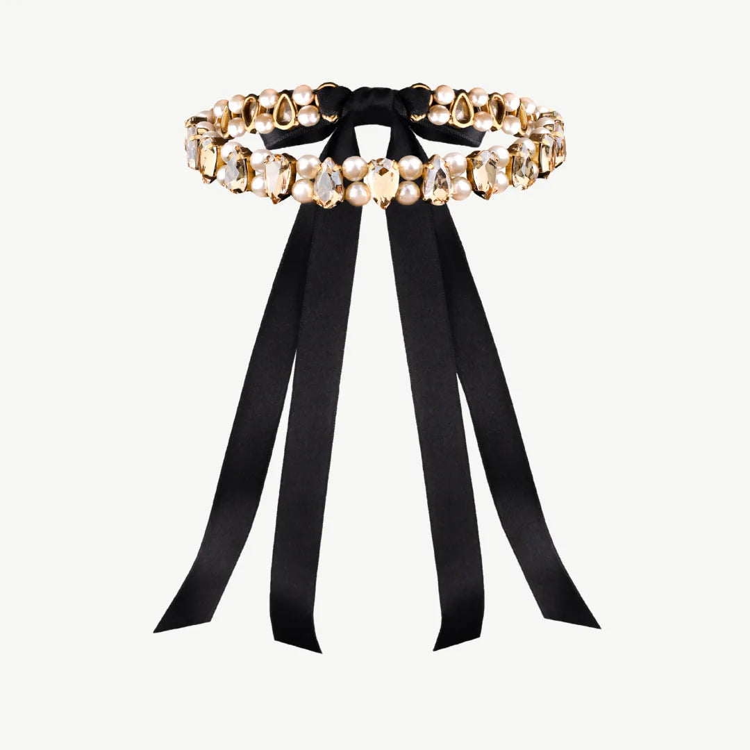 Сяйте разом зі стразовим чокером від Honch Studio. Не соромтесь поєднувати його, як з джинсовими образами, так і з коктейльними сукнями. Делікатна стрічка перетворюється в акцентний чорний бант і гармонійно довершує композицію.