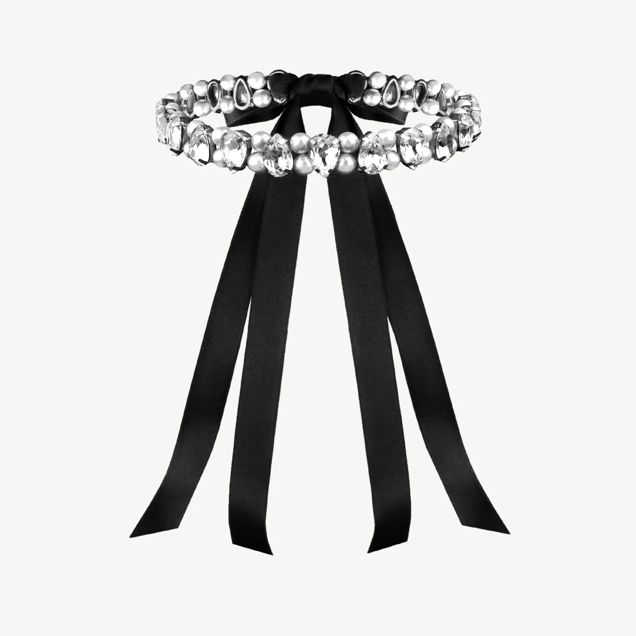 Матеріали: кришталеві стрази-краплі, 8 мм керамічні перлини, сатинова стрічка Вага: 55 грам Довжина: стразовий ряд — 33 см, стрічки по 45 см Колір: білий