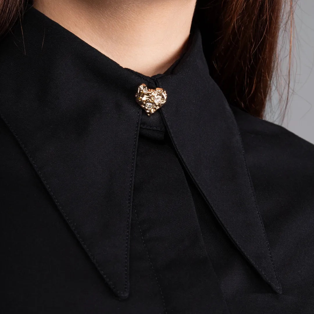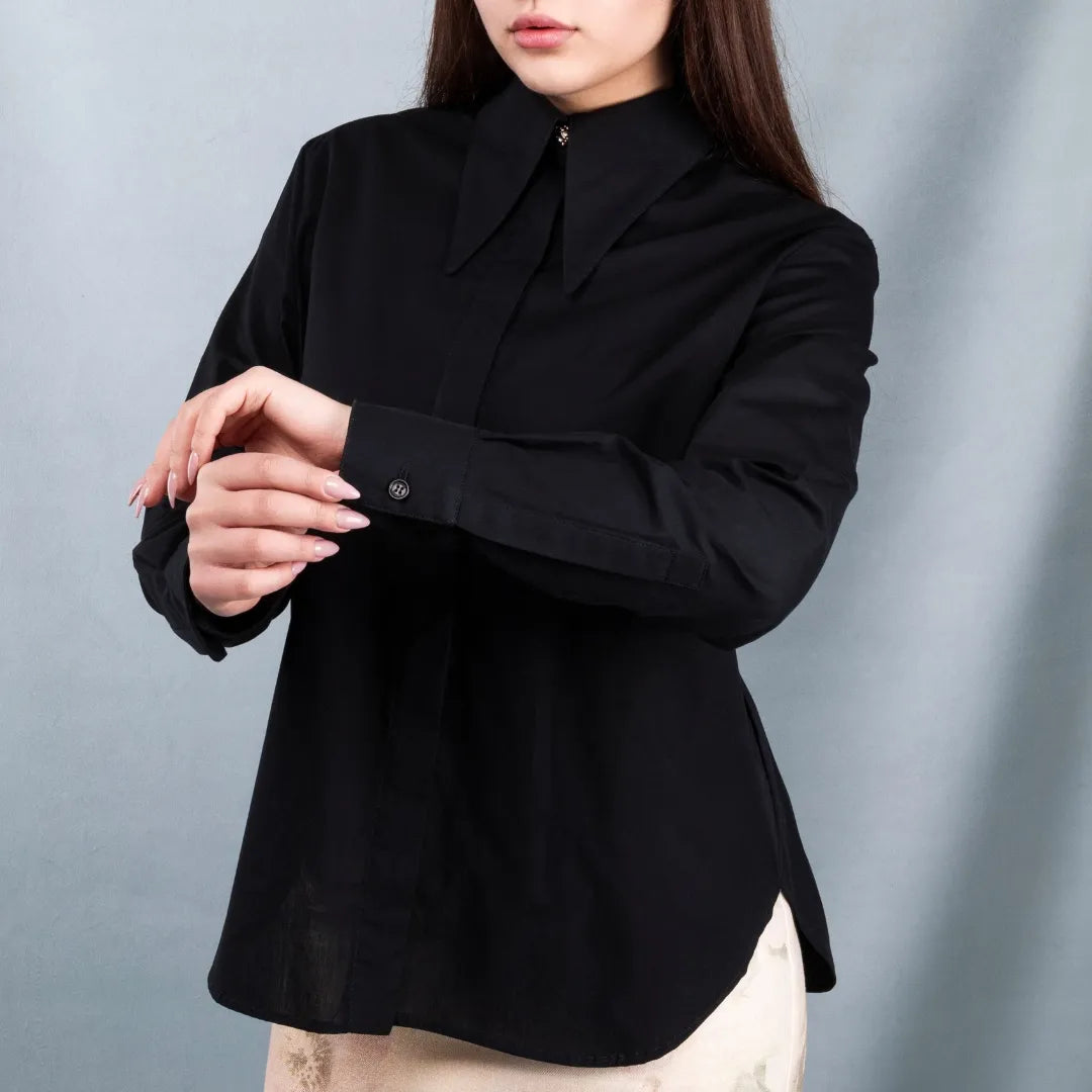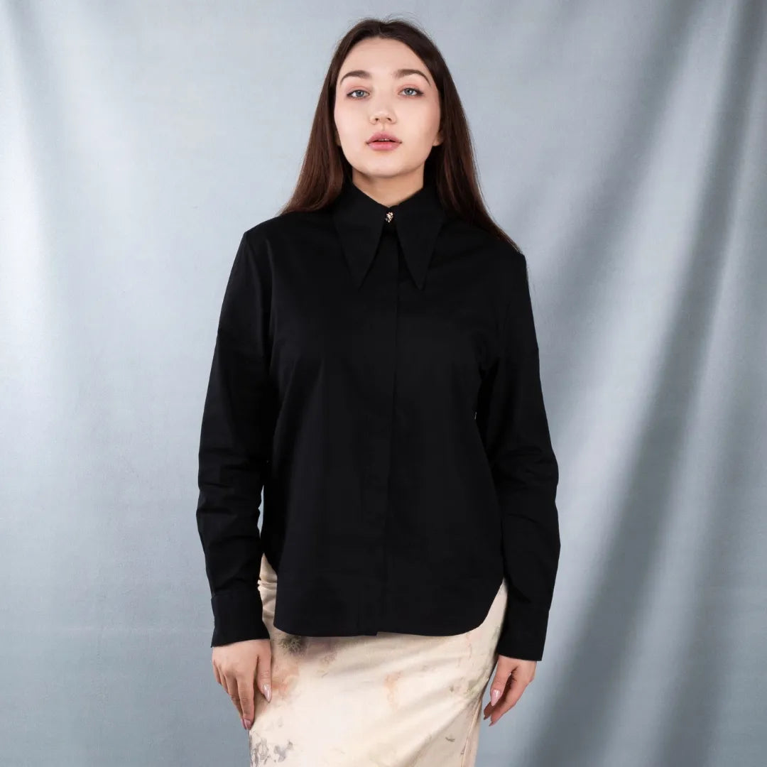 Основні деталі ▪️ прямий силует ▪️ подовжений комір з гострими кінцями ▪️ застібається на гудзики ▪️ верхній гудзик — акцентний у формі серця зі стразами ▪️ на спинці розташована складка ▪️ преміальна обробка швів ▪️ 100% бавовна ▪️ виготовлено в Україні