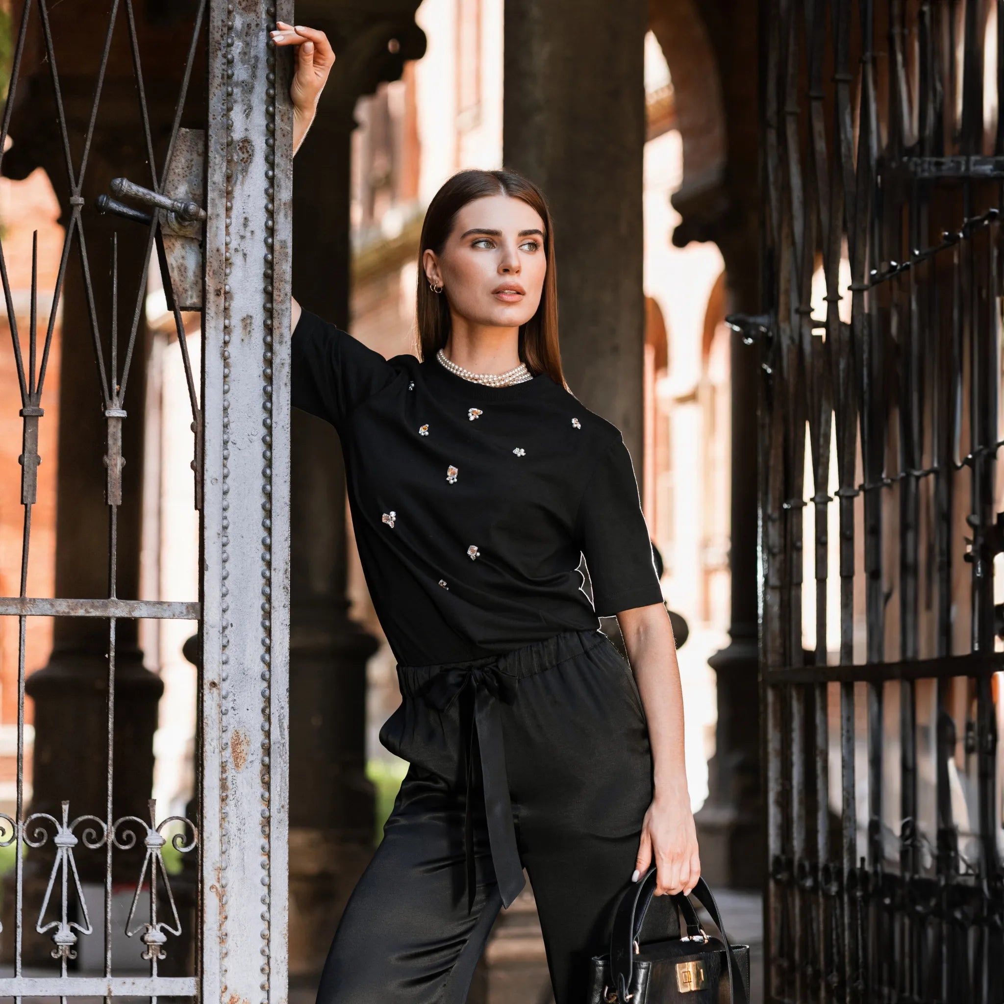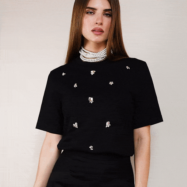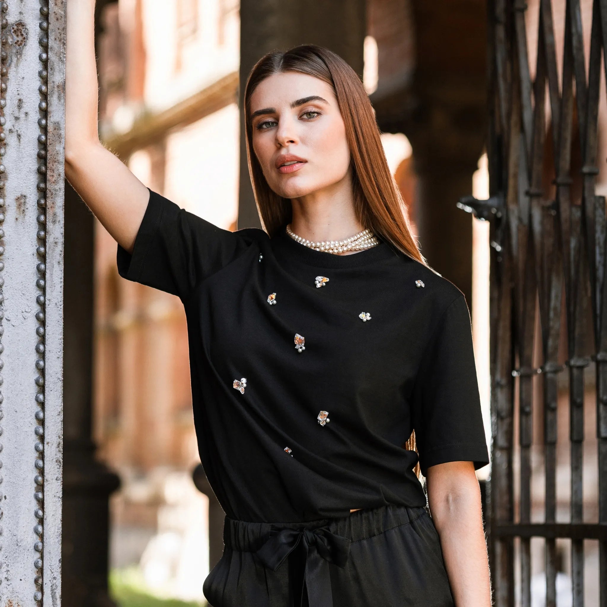 Сяючі акценти не бувають зайвими! Саме тому наша футболка доповнена стразами, які відбивають кожен промінчик, і, нага...