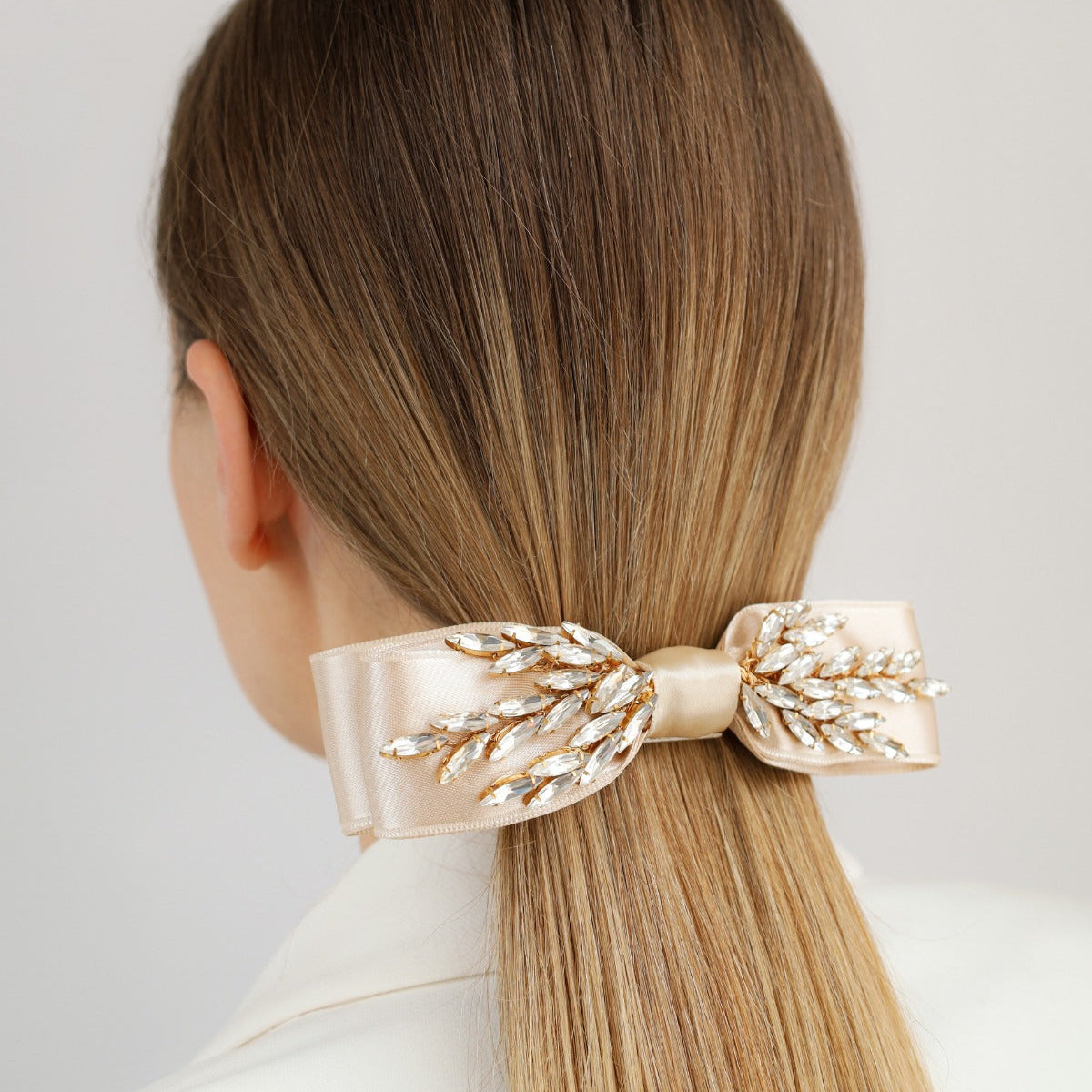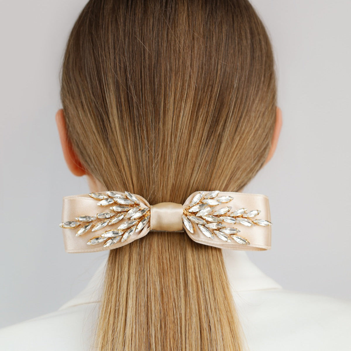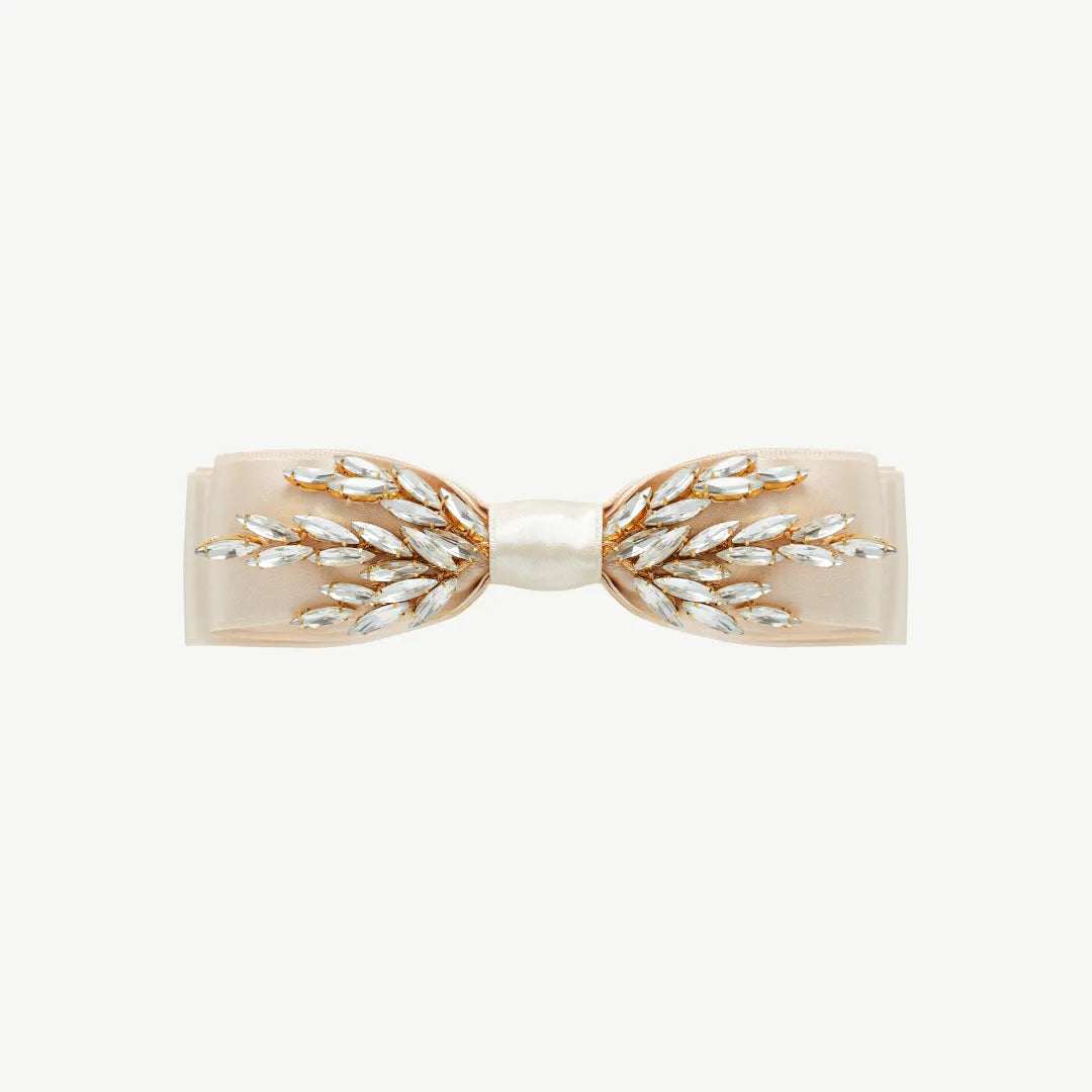 Гаррет — це ідеальне відображення позачасової класики. Сплетіння кришталевих страз утворює композицію, що нагадує тендітні колоски. Такий аксесуар чудово впишеться в гардероб любителів легких, але блискучих акцентів. Бант довершений французькою заколкою, щоб забезпечити зручну фіксацію для Вашої зачіски.