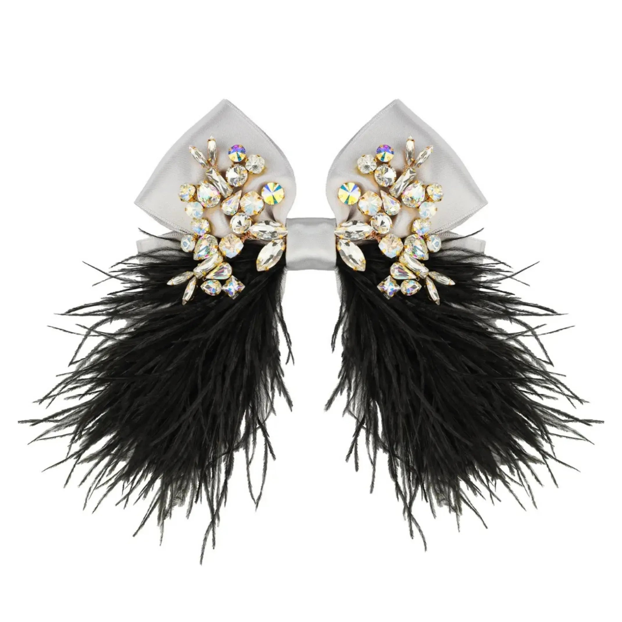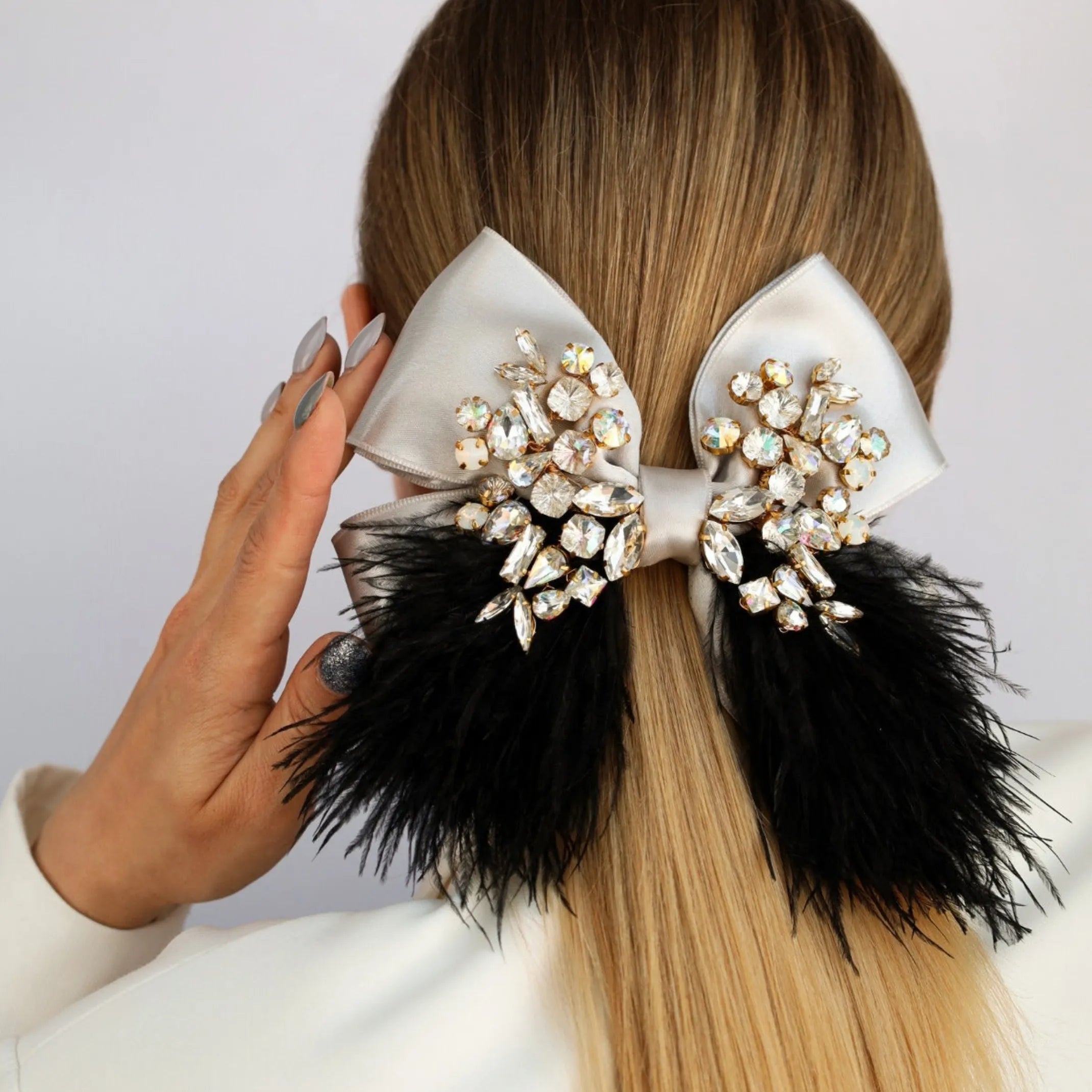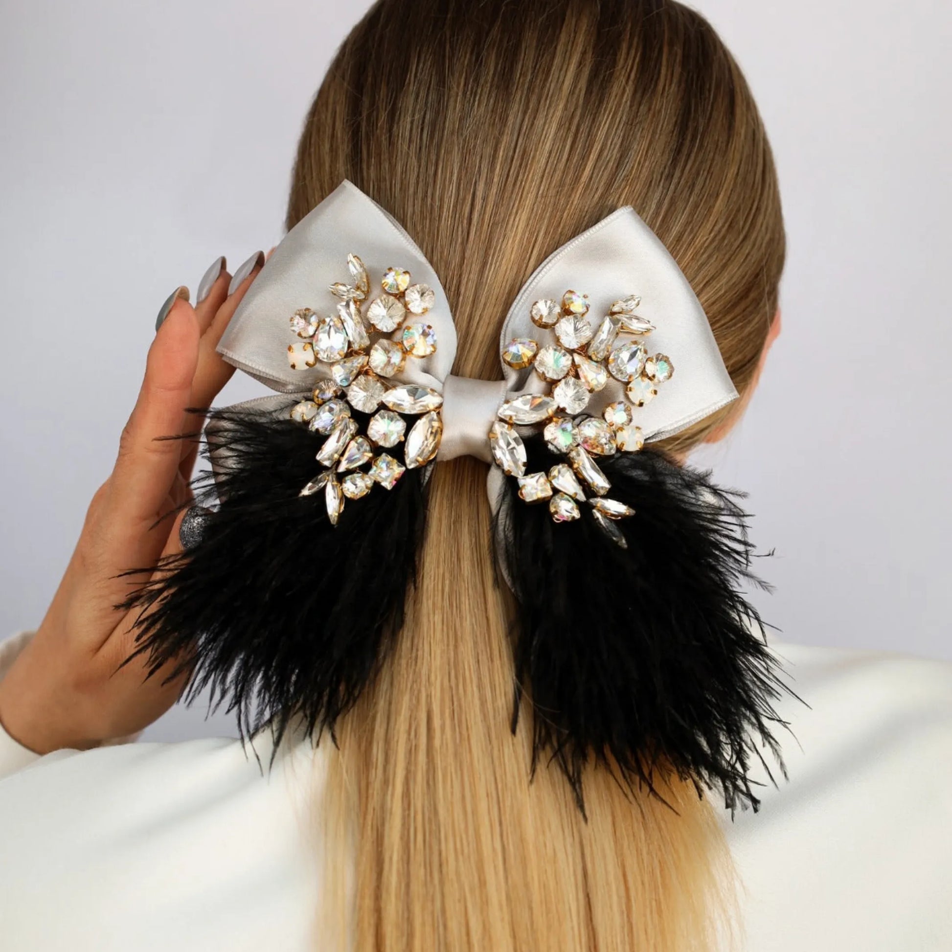 Бант Гілберт виконаний з сатинової стрічки та задекорований стразами.Розмір:Довжина - 18 см (включаючи пір'я)Ширина -...