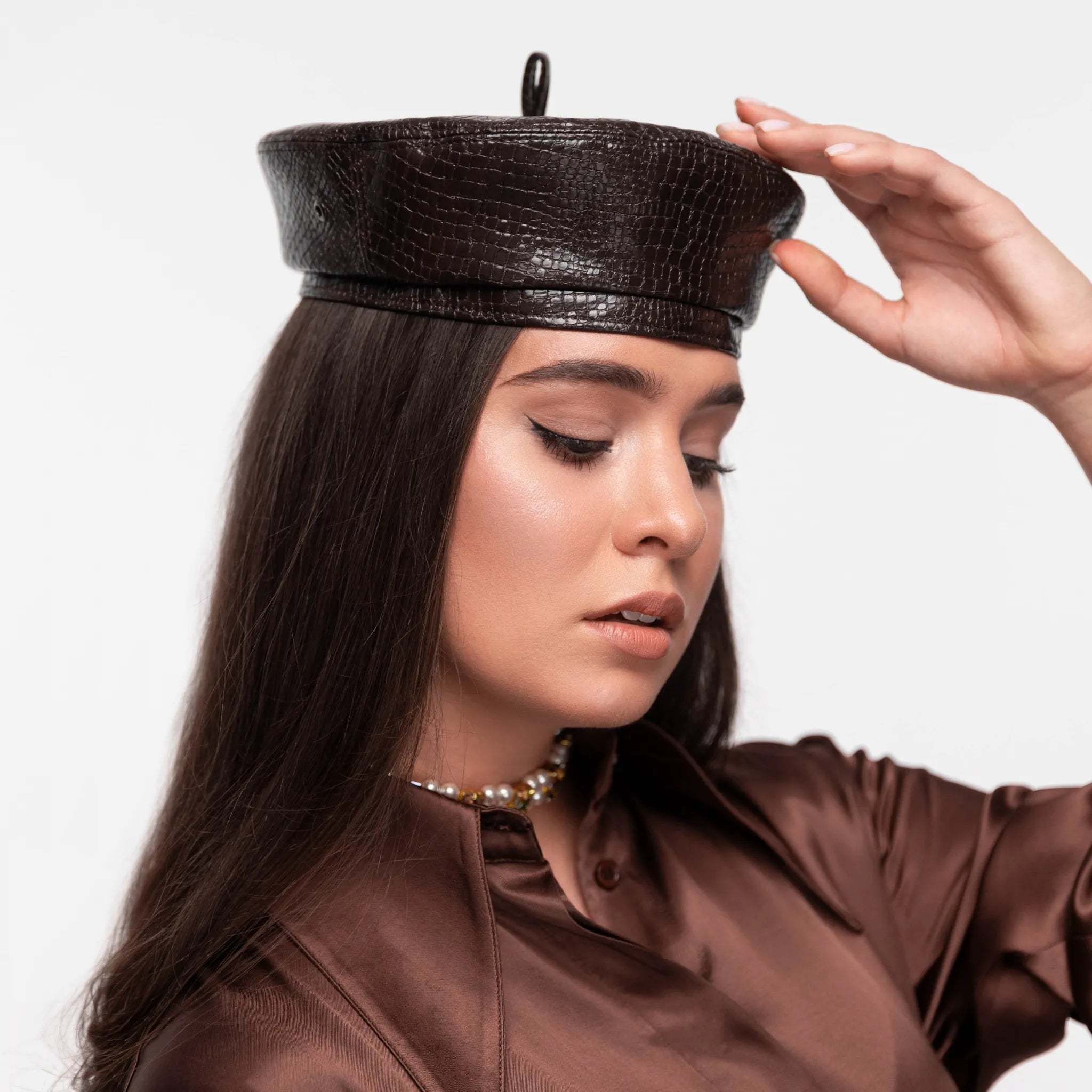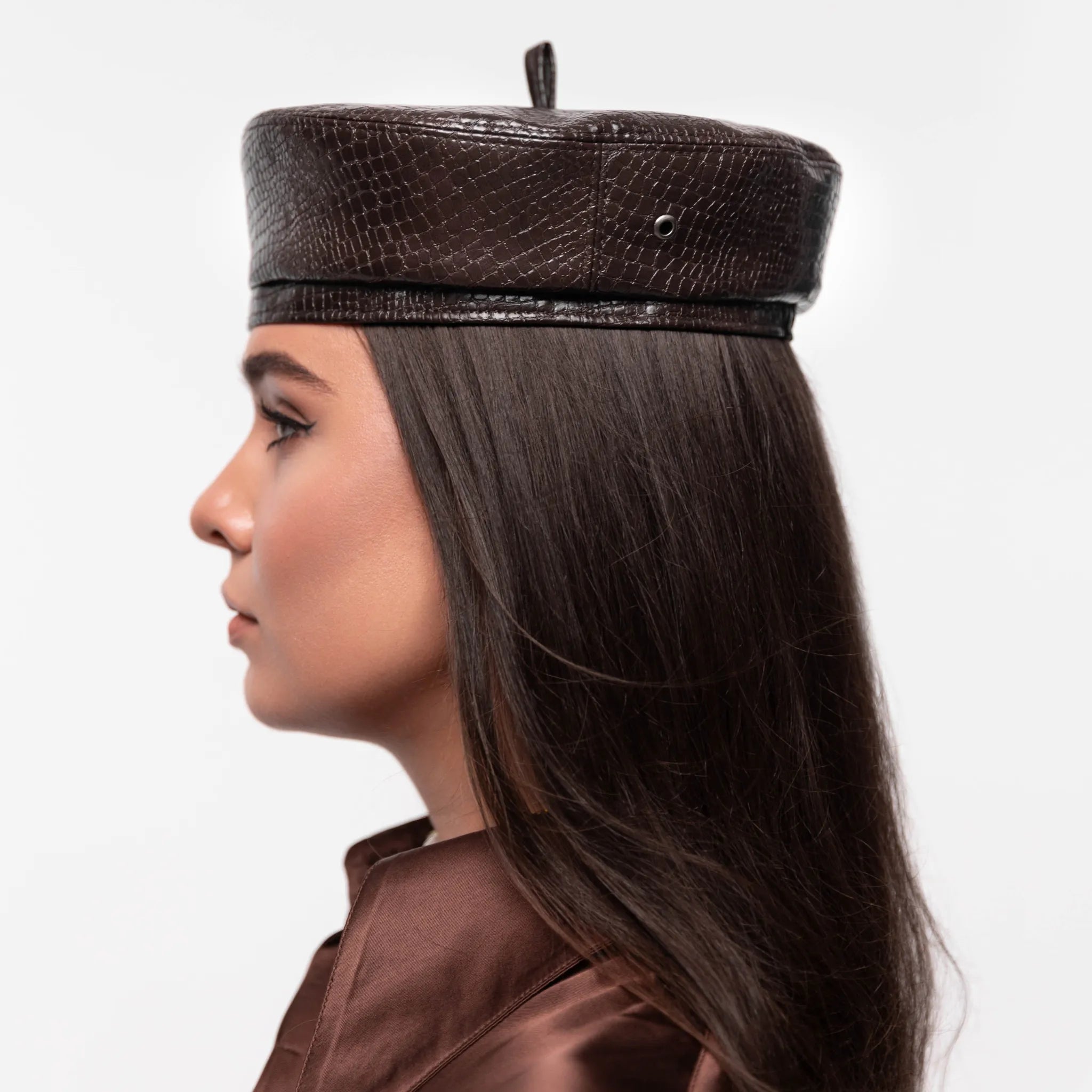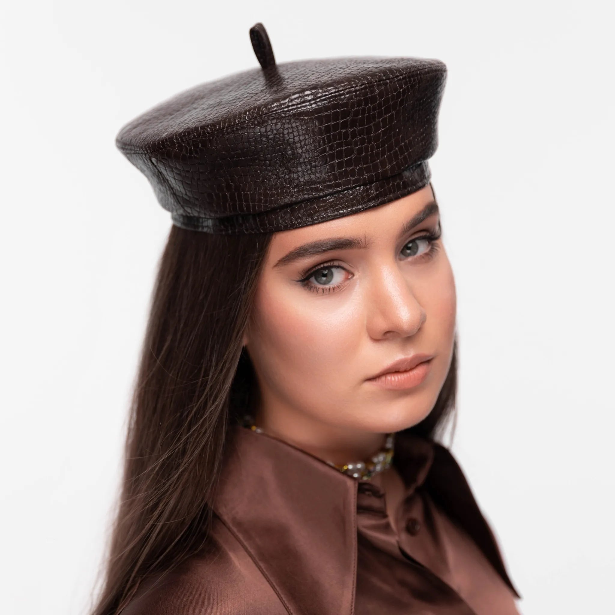 Берет класичної форми, виконаний з італійської екошкіри. Позаду розташована стягуюча резинка, що дозволяє підлаштуватись під Ваш розмір голови. Підкладка зроблена з віскози.