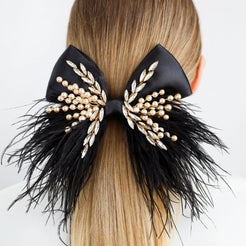 Чорний колір атласної стрічки надає банту з колекції Маргарет природного шарму та гармонії. Пір'я, яке тремтить від кожного вашого руху та подиху вітру, додає особливої грації та шарму.