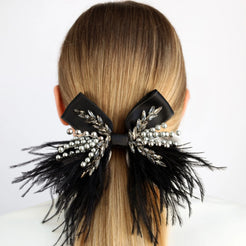 Чорний колір атласної стрічки надає банту з колекції Маргарет природного шарму та гармонії. Пір'я, яке тремтить від кожного вашого руху та подиху вітру, додає особливої грації та шарму.