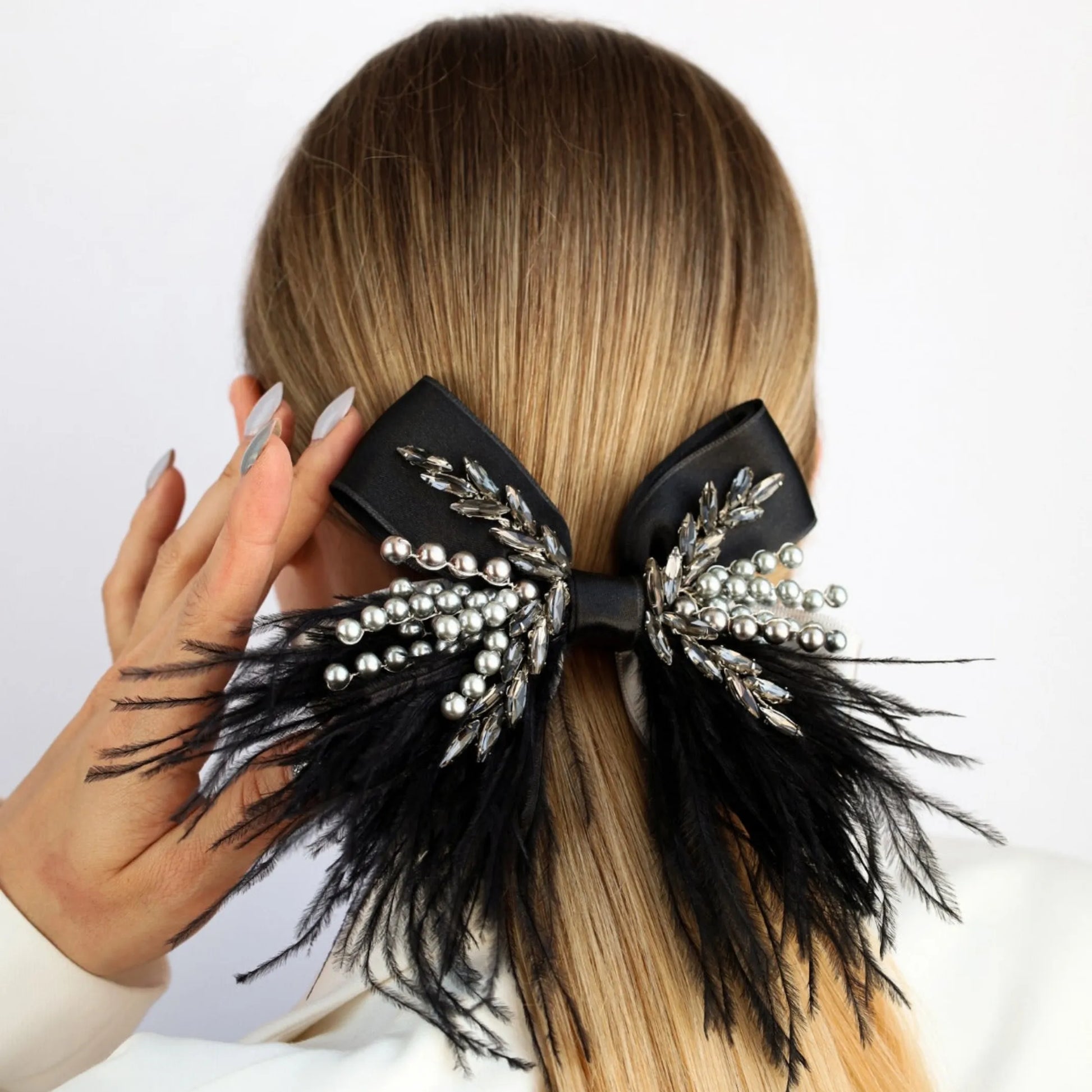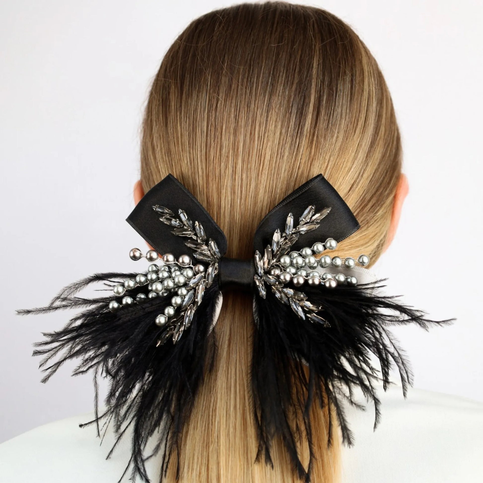 Чорний колір атласної стрічки надає банту з колекції Маргарет природного шарму та гармонії. Пір'я, яке тремтить від к...