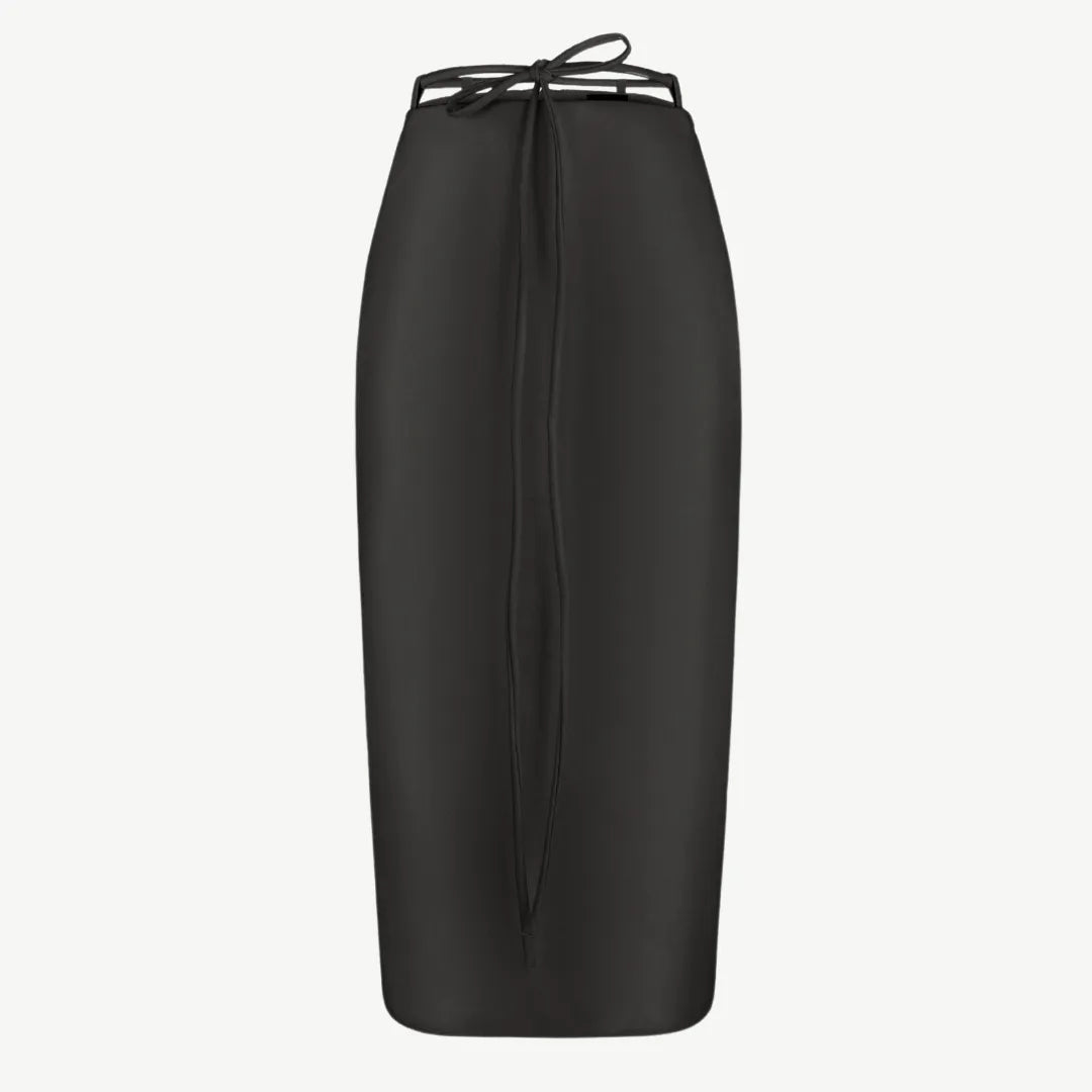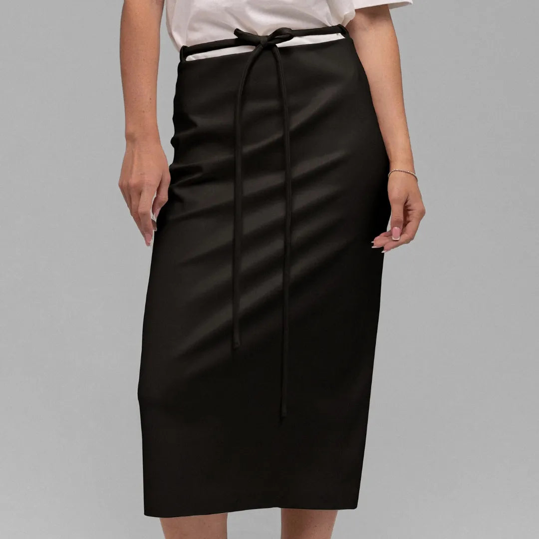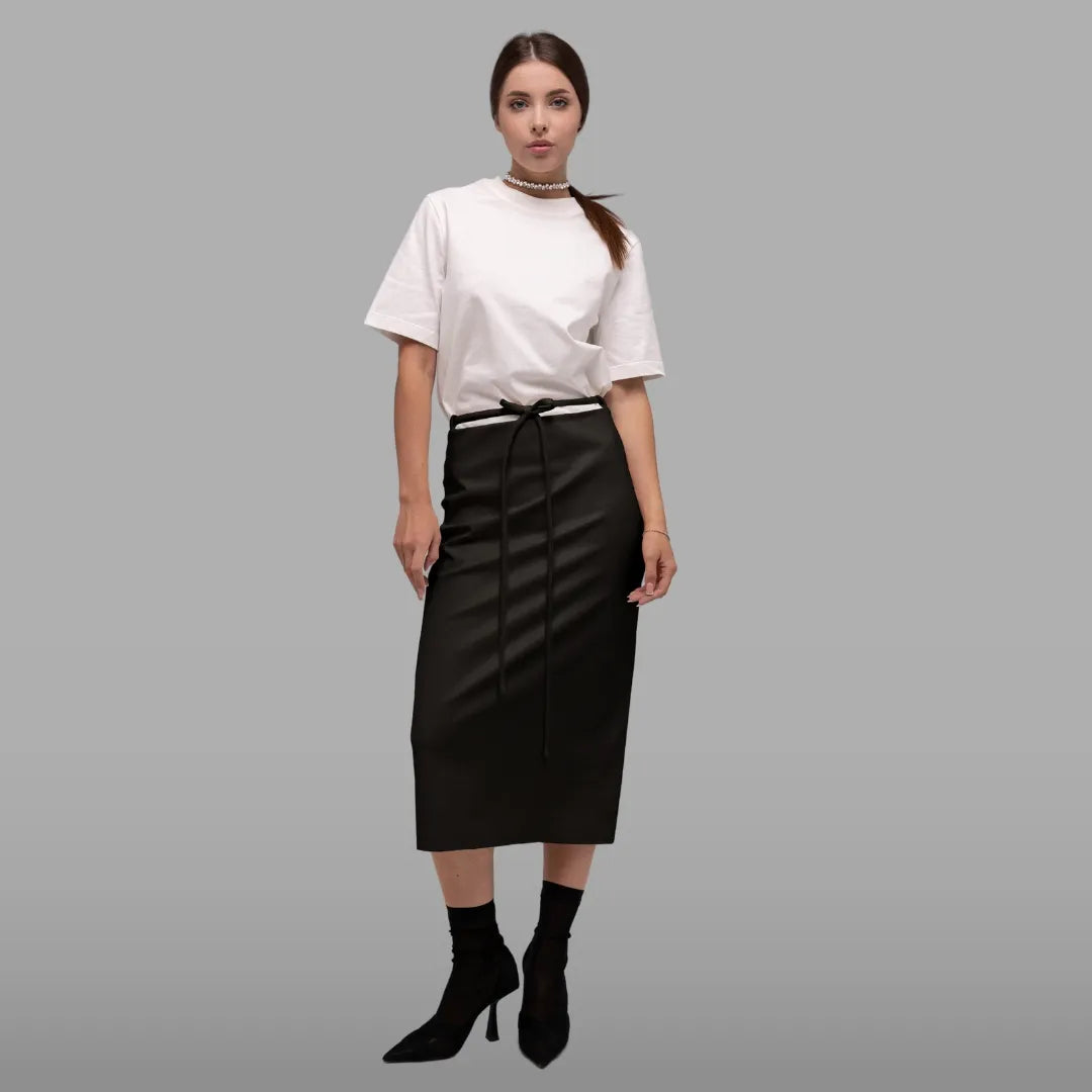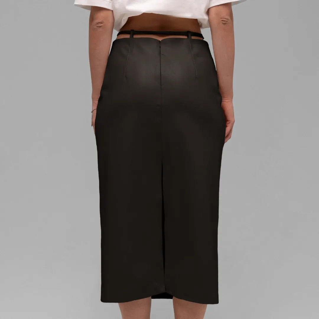 Потіште себе зухвалою елегантністю! Спідниця з гладкої шкіри довжини міді стане центральним елементом ваших осінніх образів. Вона отримала ненав'язливий, але цікавий, акцент у вигляді вузького поясу. Для створення вишуканих вечірніх образів комбінуйте її з високими шпильками, а для невимушених аутфітів — з улюбленими кросівками.