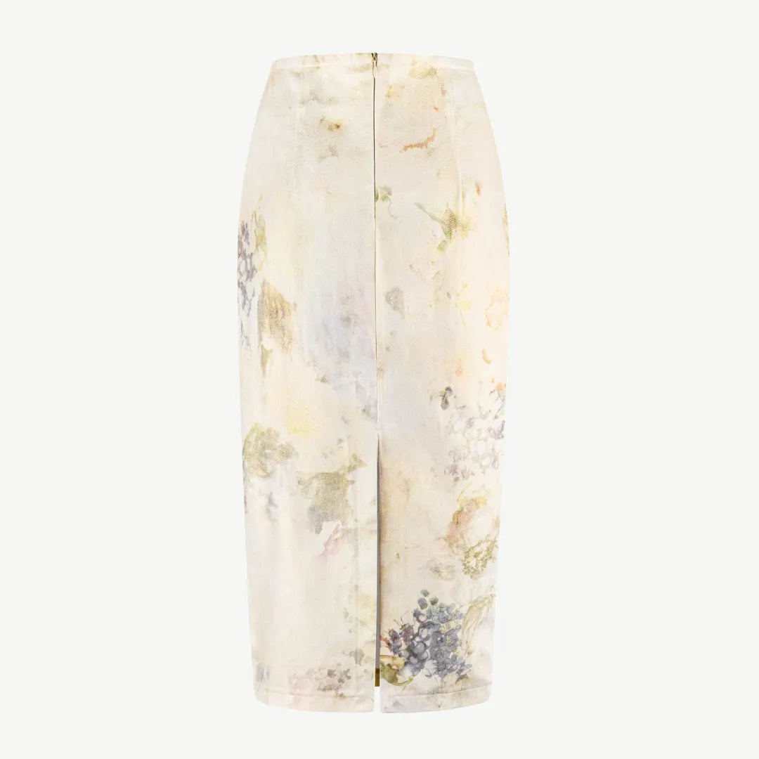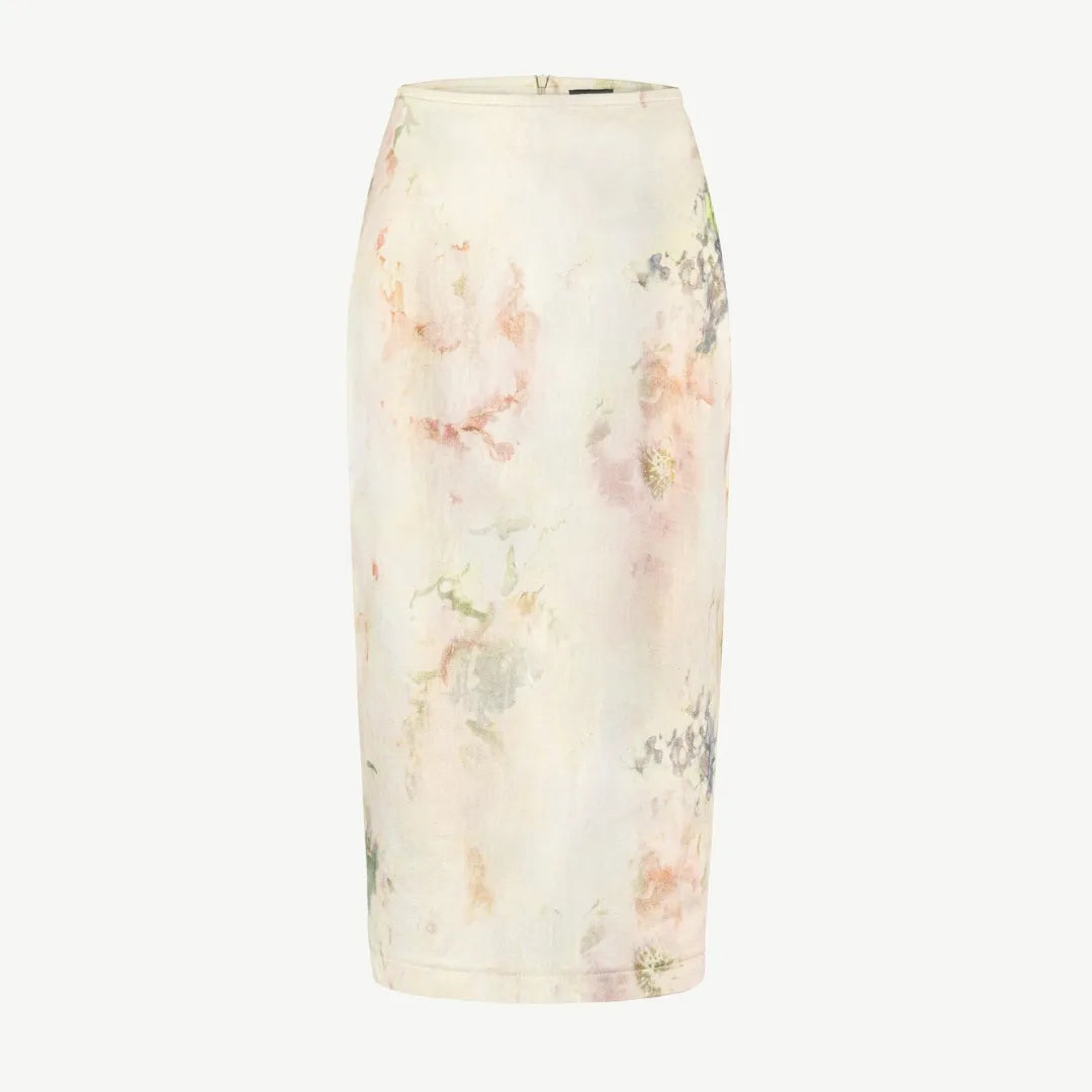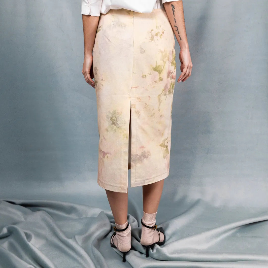 Ця джинсова спідниця — справжнє втілення мистецтва. Немов акварельний живопис на полотні, ніжний квітковий принт розтікається по щільному джинсу, а золотисте блискуче напилення тканини буде лагідно виблискувати під променями сонця. Вона чудово поєднуватиметься з кежуальними луками, так і з класичними сорочками.