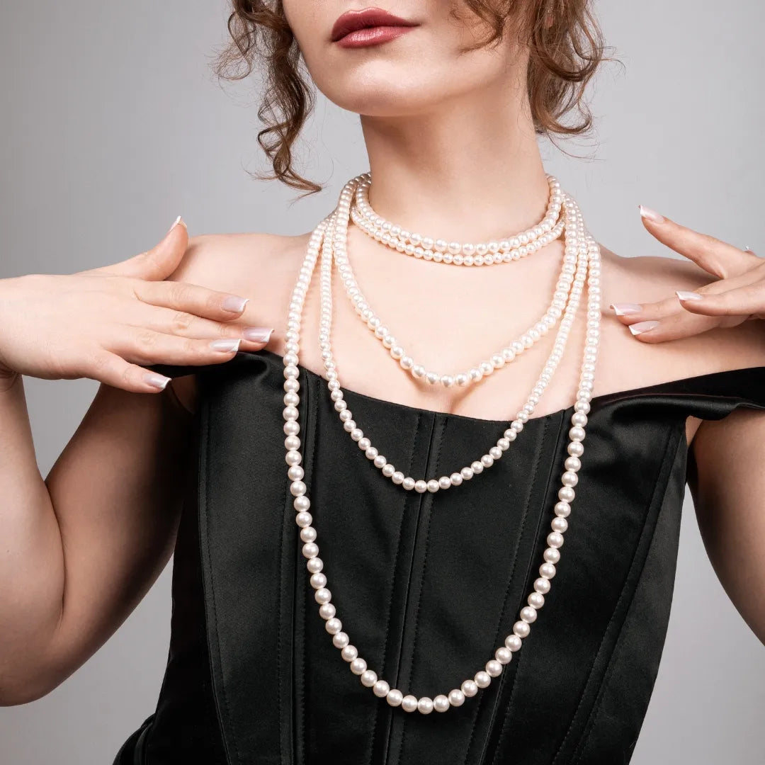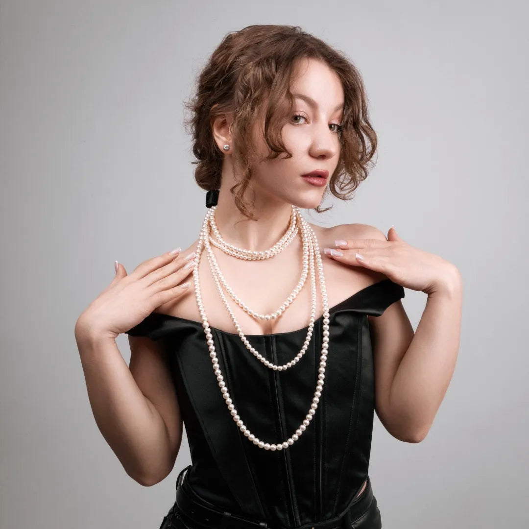 Тренд на перлини — точно наш! Адже ми завжди були прихильниками тендітного перламутрового блиску. Саме тому ми створили намисто з 5 рядів перлин різного діаметра. Перламутрові ряди різної довжини утворюють тендітну композицію, а контрастні чорні стрічки слугують фіксатором прикраси.