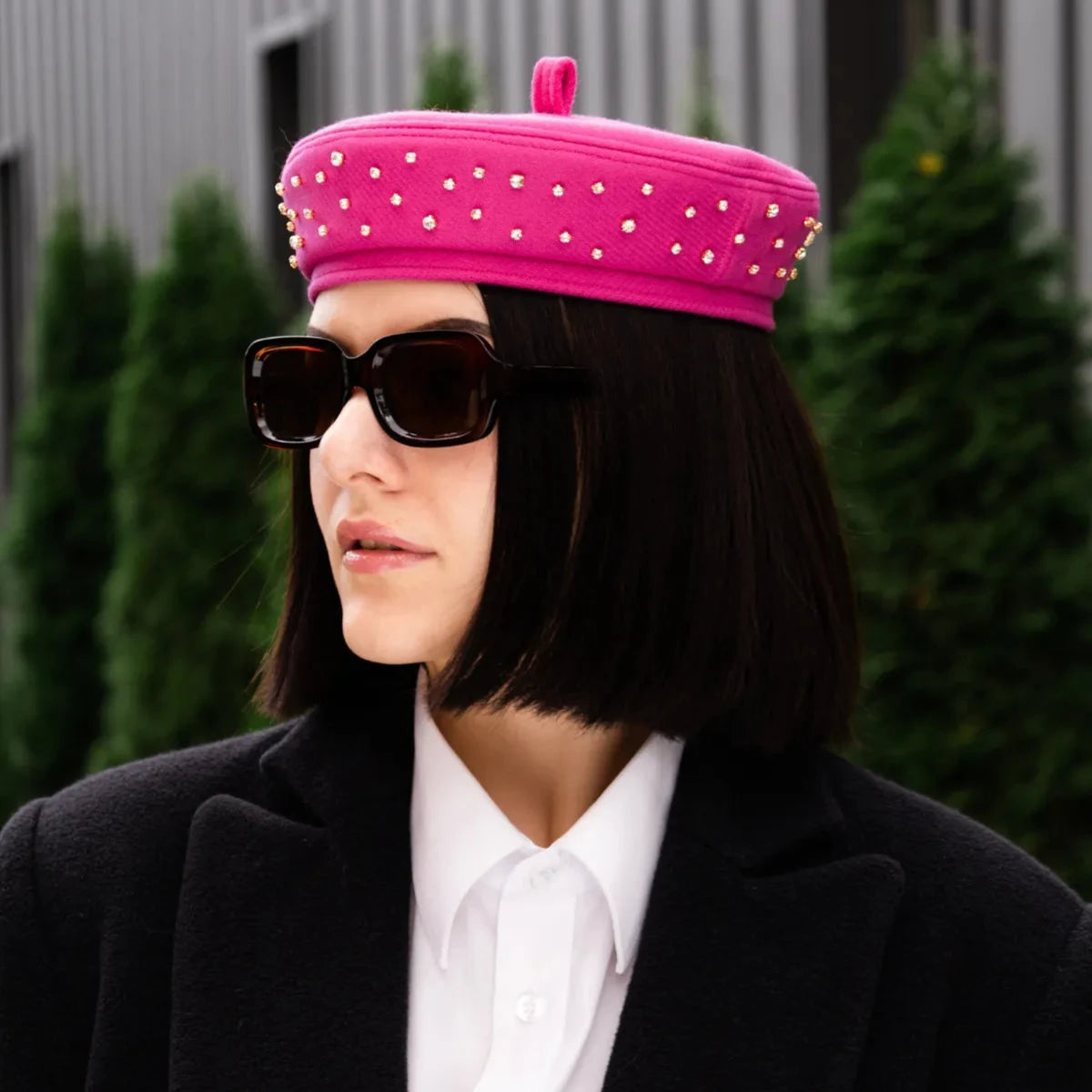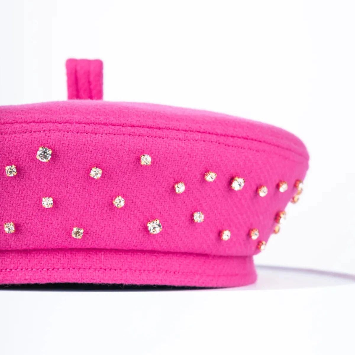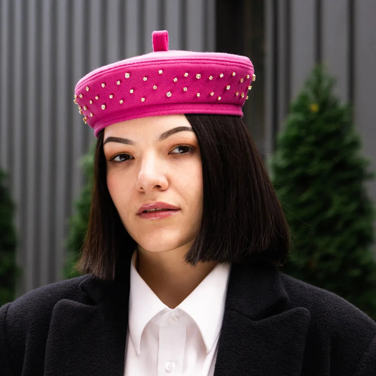 Берет класичної форми з пришитими стразами, виконаний з натуральної вовни. Позаду розташована стягуюча резинка, що дозволяє підлаштуватись під Ваш розмір голови. Підкладка зроблена з віскози.