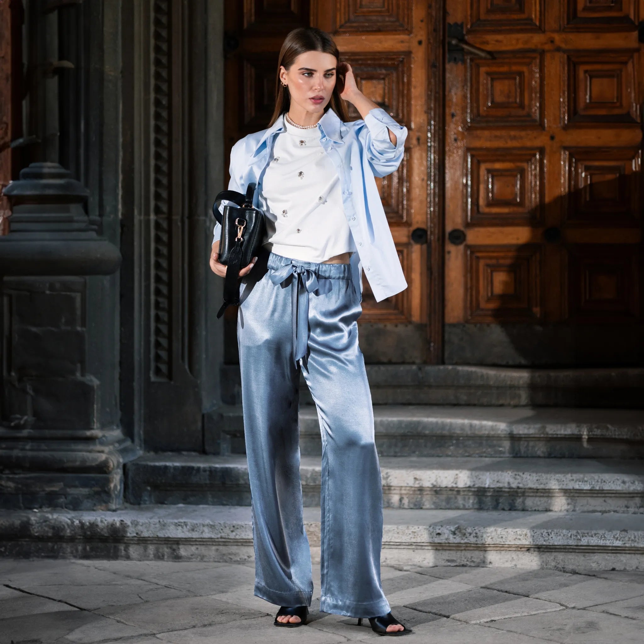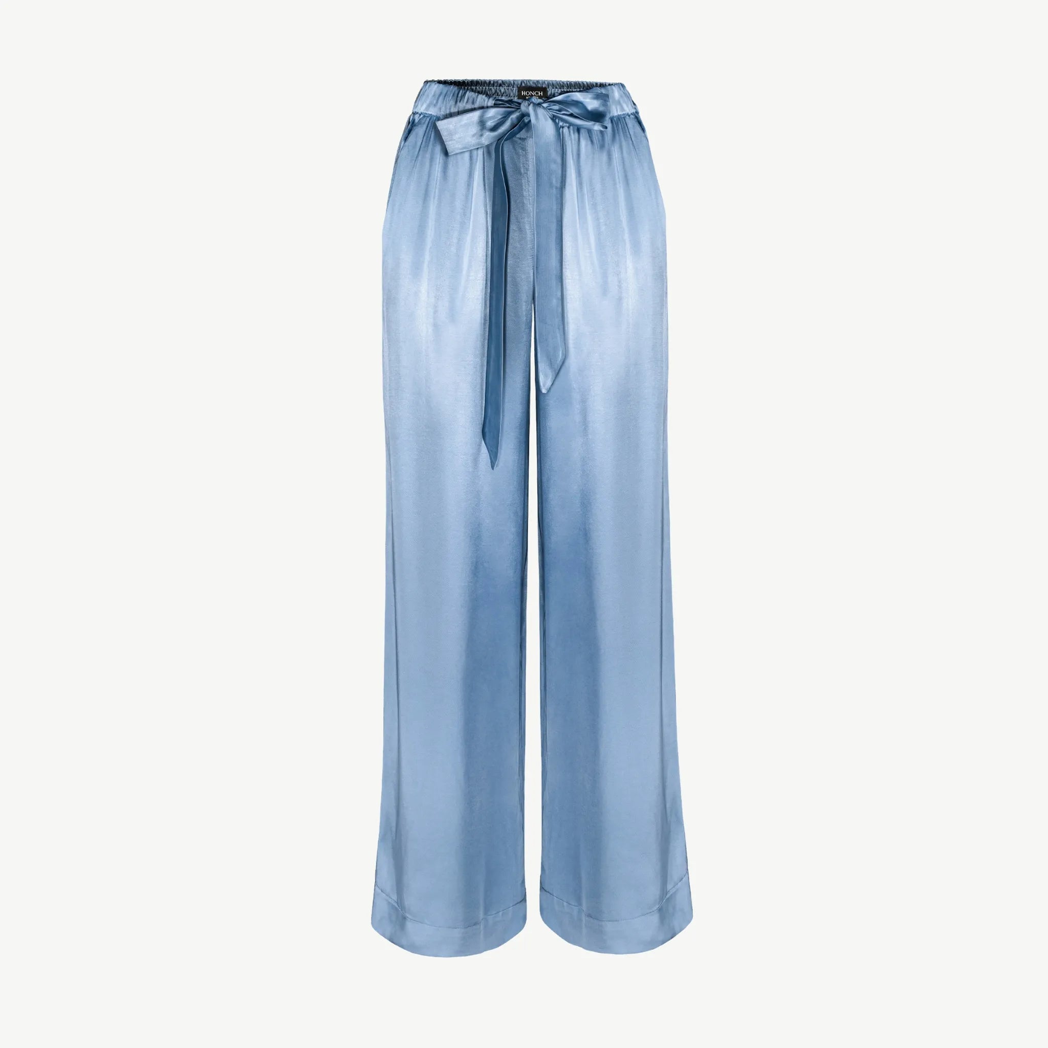 Віскозні штани піжамного стилю створені, щоб дарувати легкість вашому образу. Вони мають прямий силует, що не сковує рухи, а посадка регулюється завдяки протягнутому поясу, який можна зав'язати у бант. Особливості тканини штанів забезпечать відчуття комфорту навіть у літню спеку.