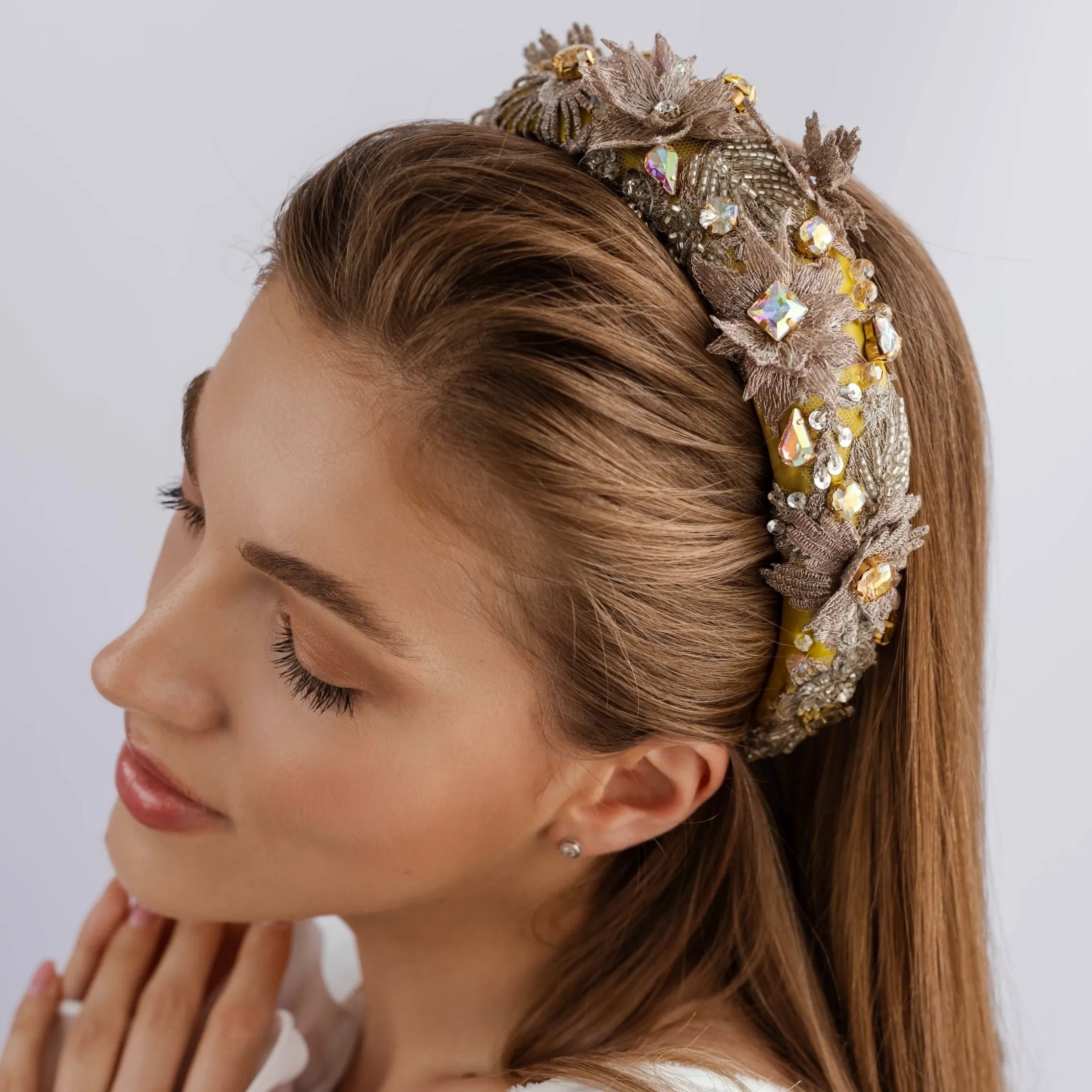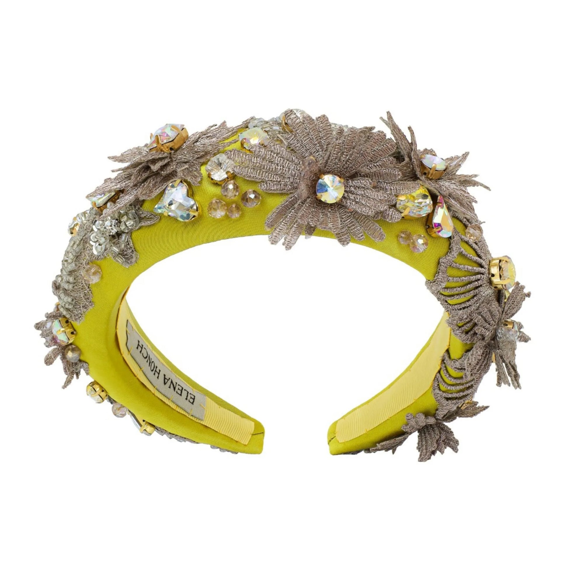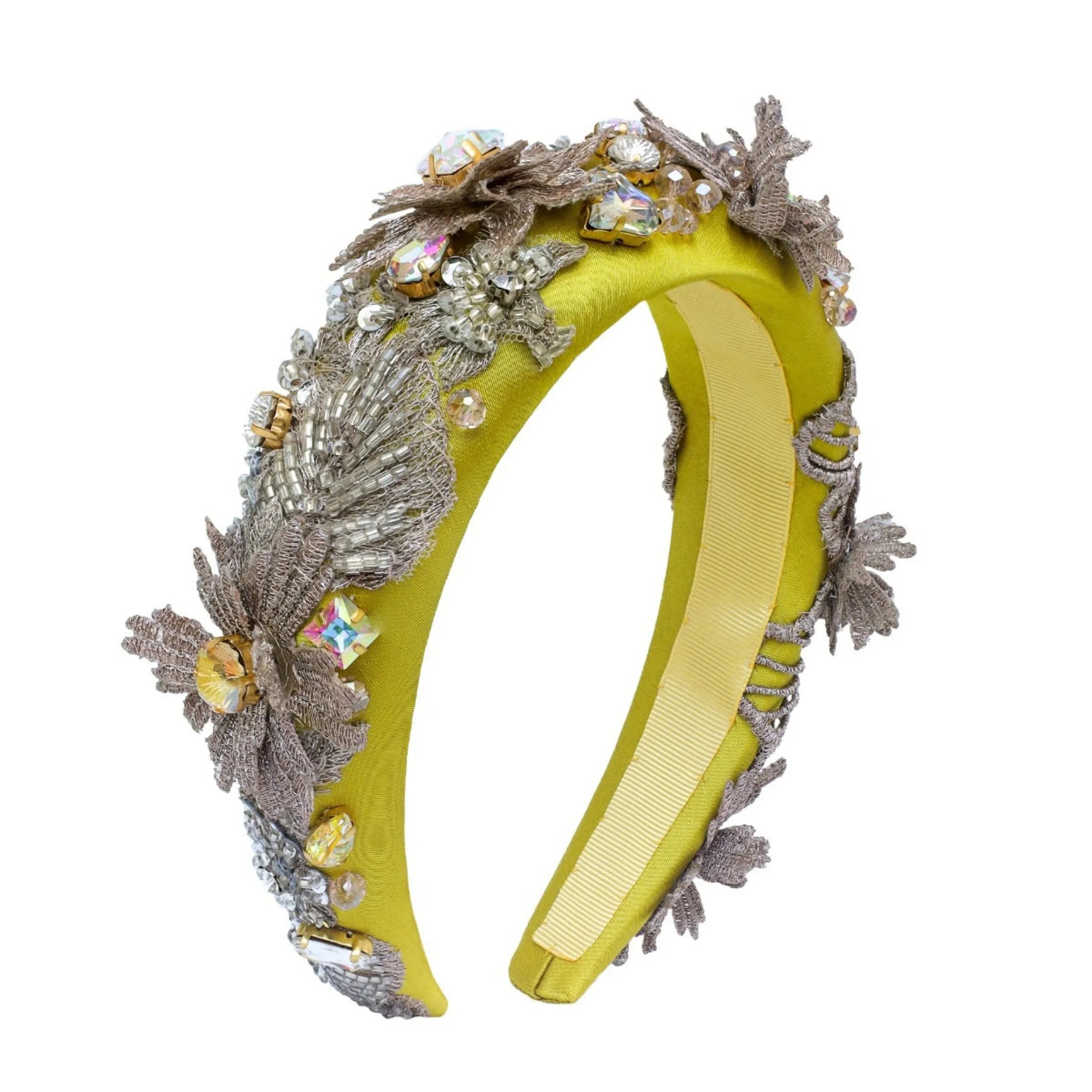 Контрастне поєднання квіткового мережива та блискучих страз. Ця пов'язка на голову настільки квіткова, що в повітрі витає аромат цвітіння. Аксесуар добре сидить на голові протягом усього дня завдяки внутрішньому шару з гросгрену.