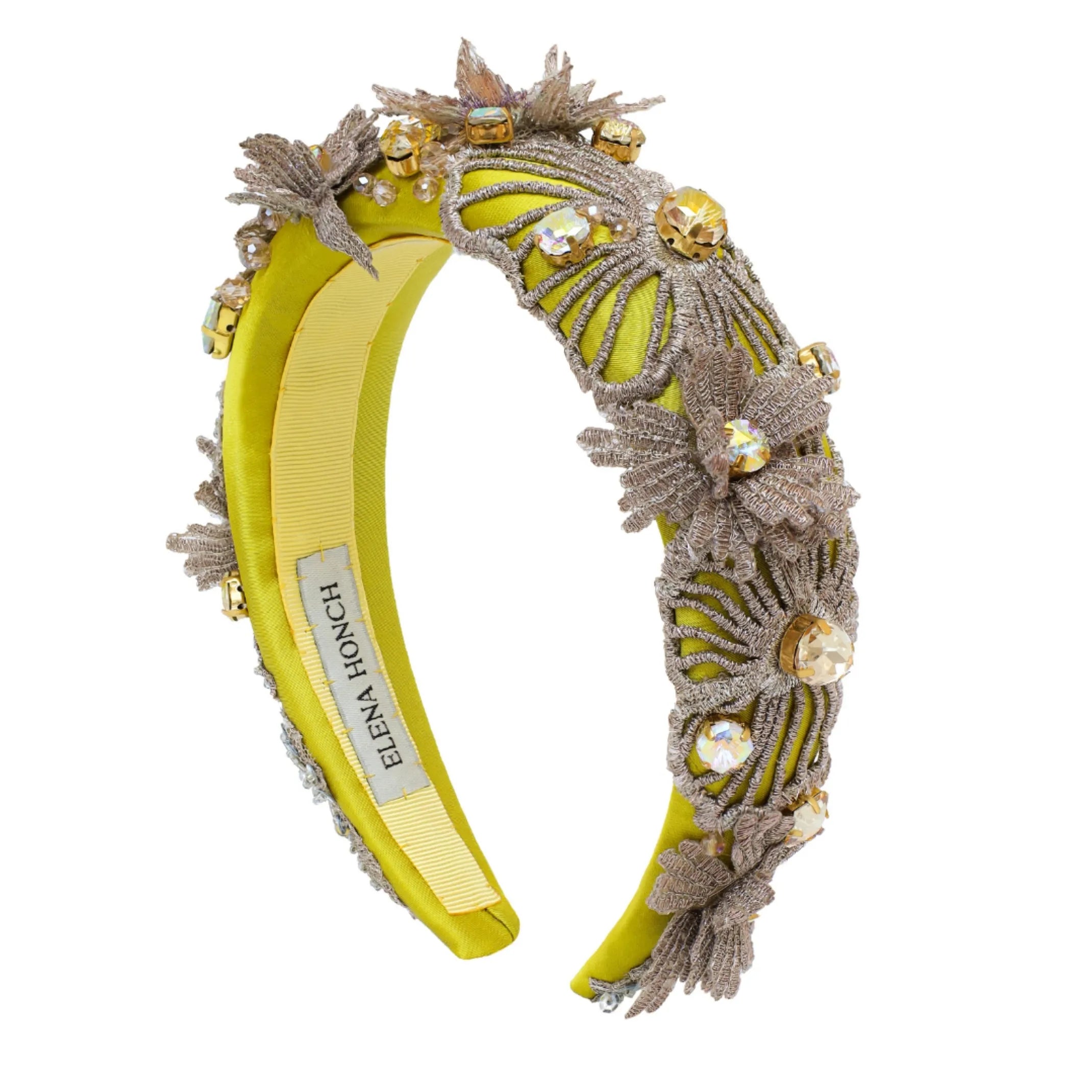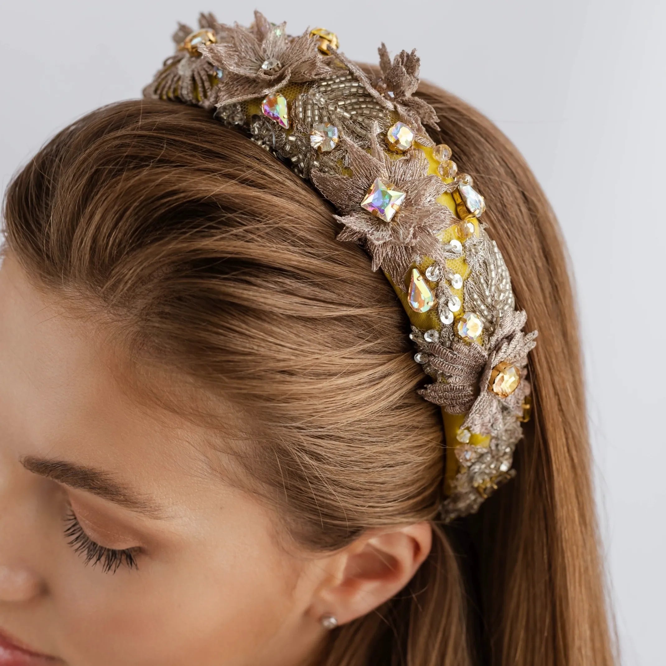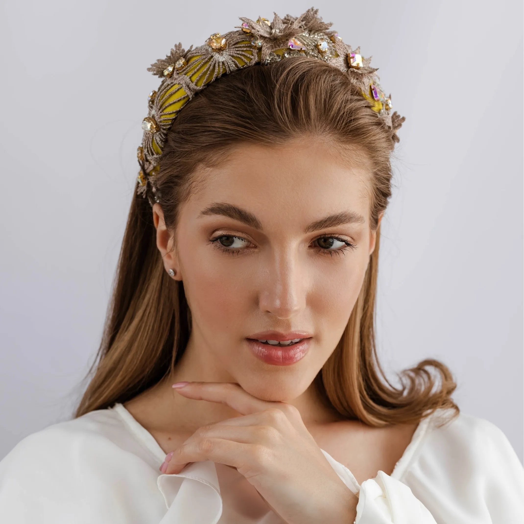 Контрастне поєднання квіткового мережива та блискучих страз. Ця пов'язка на голову настільки квіткова, що в повітрі витає аромат цвітіння. Аксесуар добре сидить на голові протягом усього дня завдяки внутрішньому шару з гросгрену.