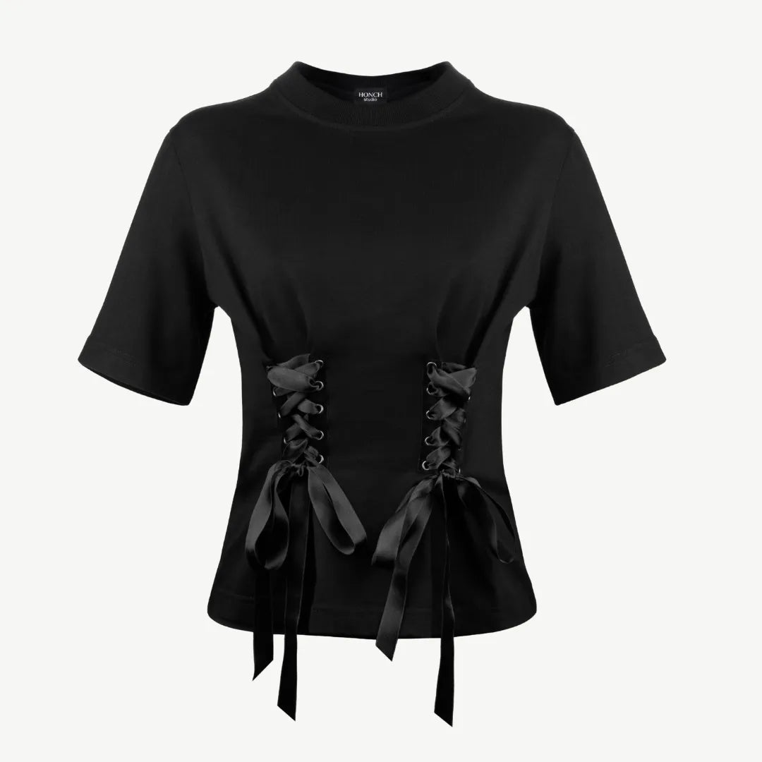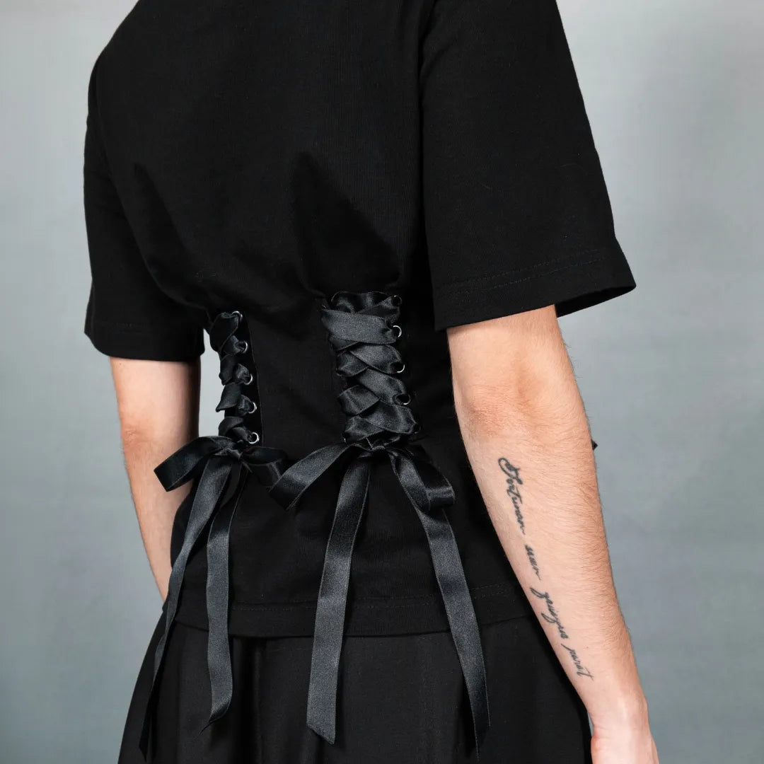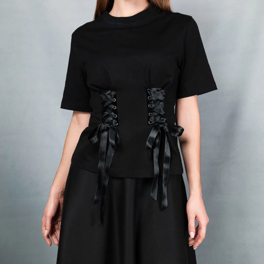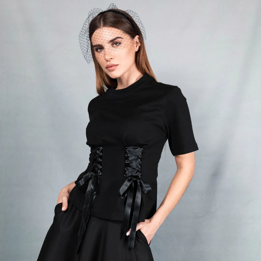 Базові предмети гардероба не обов'язково повинні бути нудними. Ми створили футболку з цікавою деталлю — корсетною шнурівкою з атласними стрічками. Таке дизайнерське рішення привертає увагу до вашої талії та робить ефектний силует. Це ідеальний баланс між мінімалізмом і виразністю.