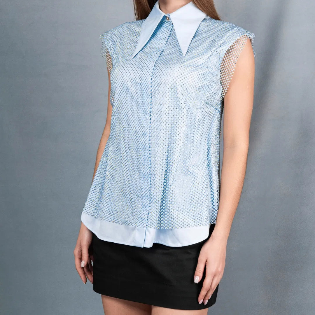 Легка блакитна сітка, оздоблена блискучими стразами, які переливаються із зеленого у фіолетовий. З нею легко створювати багатошарові образи разом з сорочками, светрами чи лонгслівами. Робіть ваші будні яскравішими, додавши цього тендітного блиску!