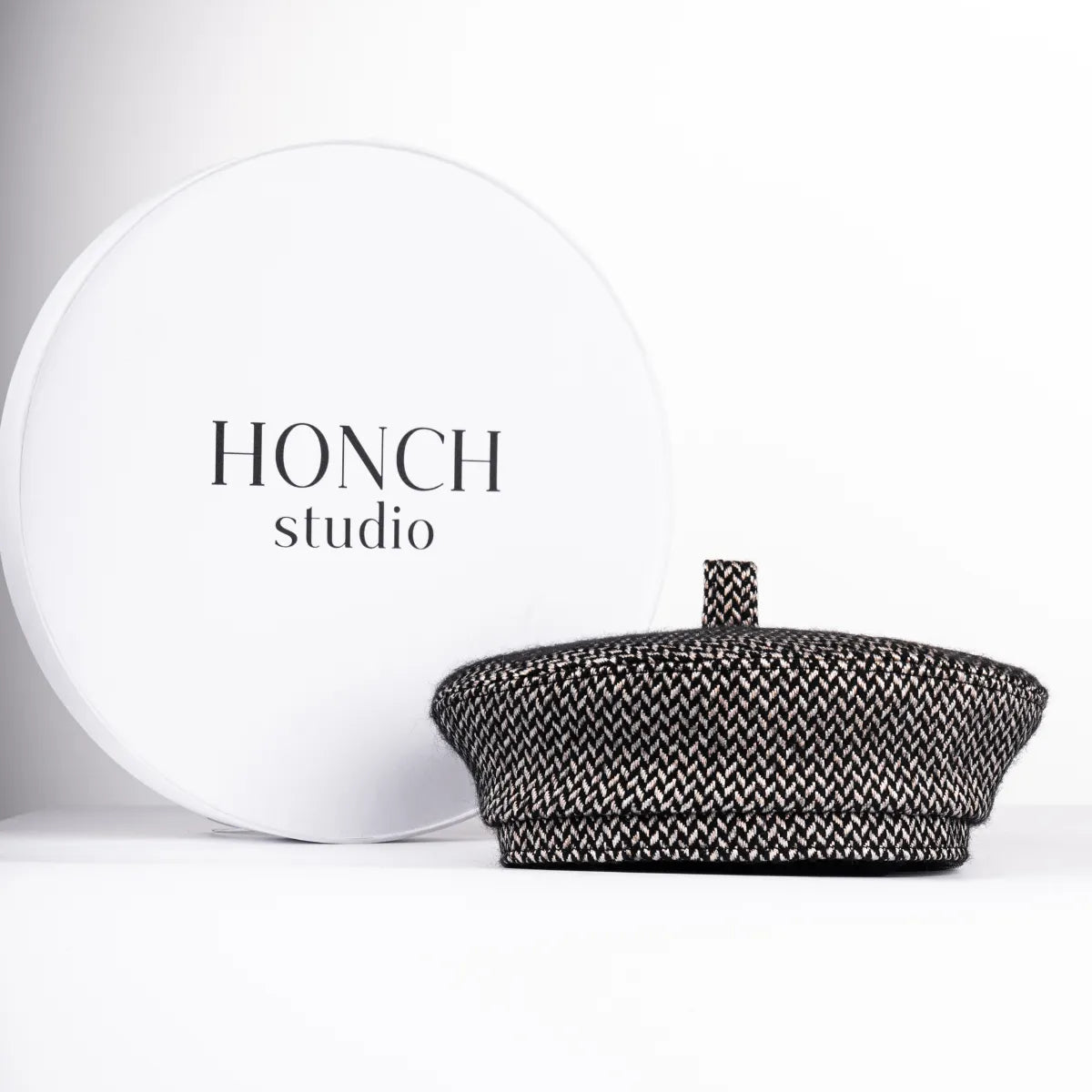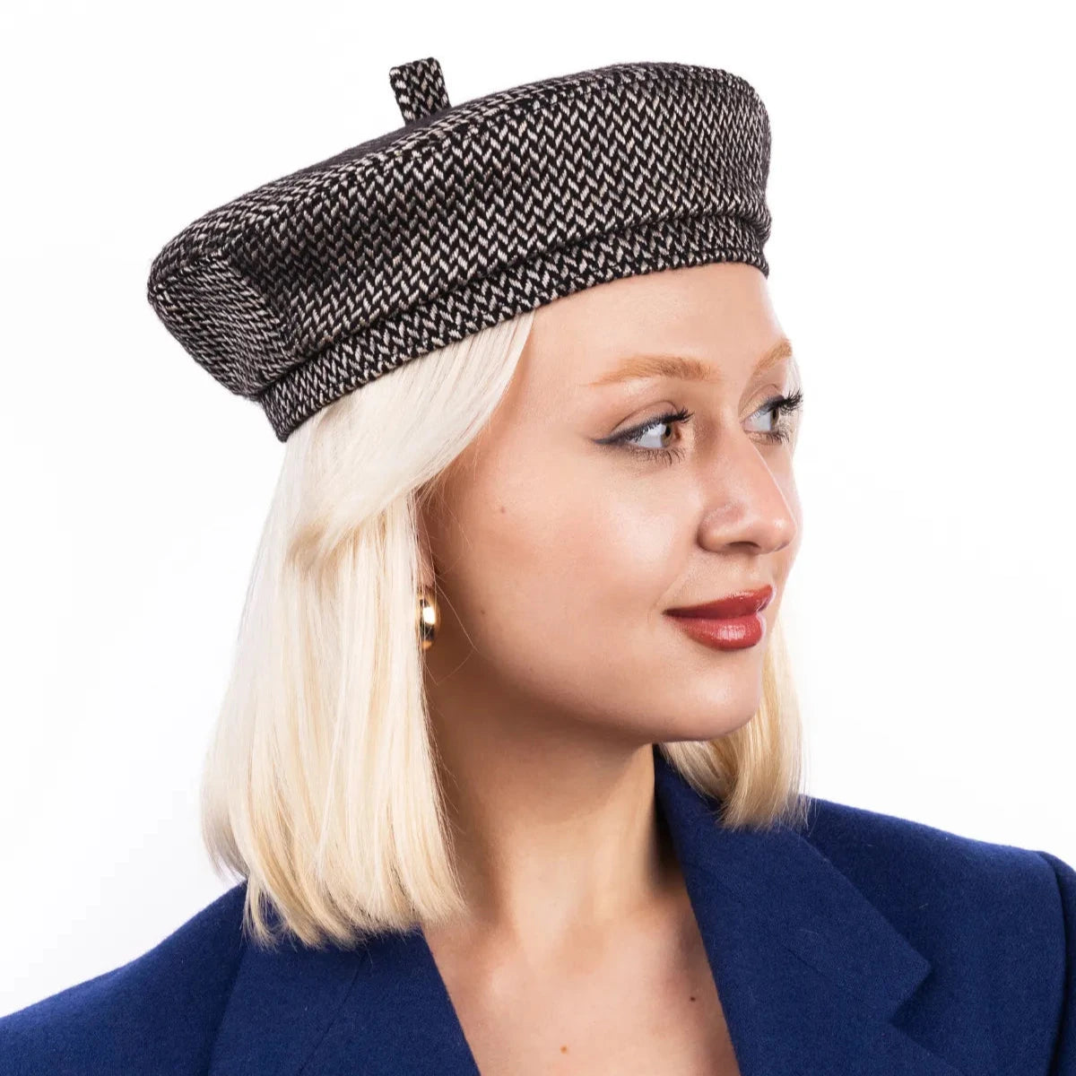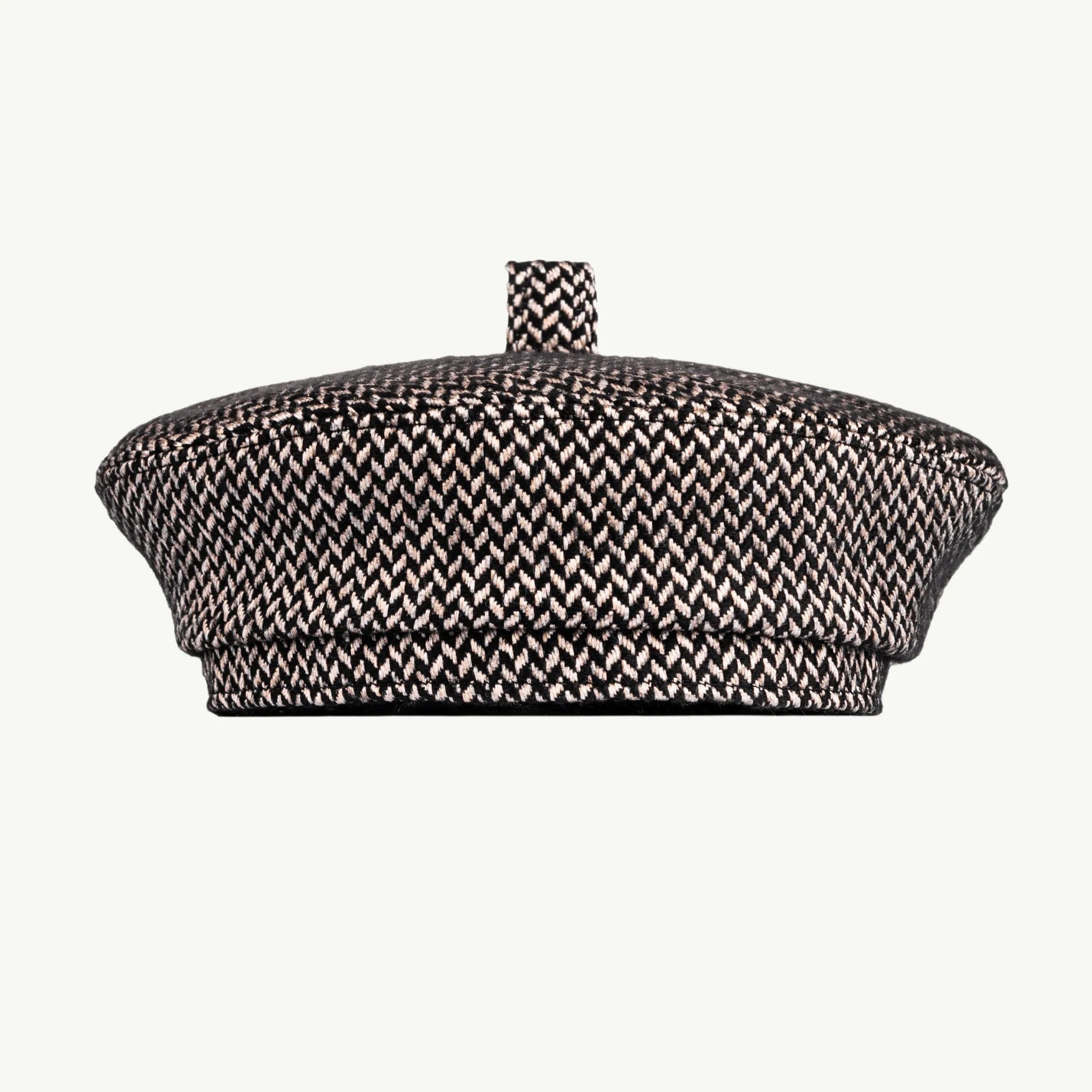 Берет класичної форми, виконаний з преміальної італійської твідової тканини з люрексом. Позаду розташована стягуюча р...